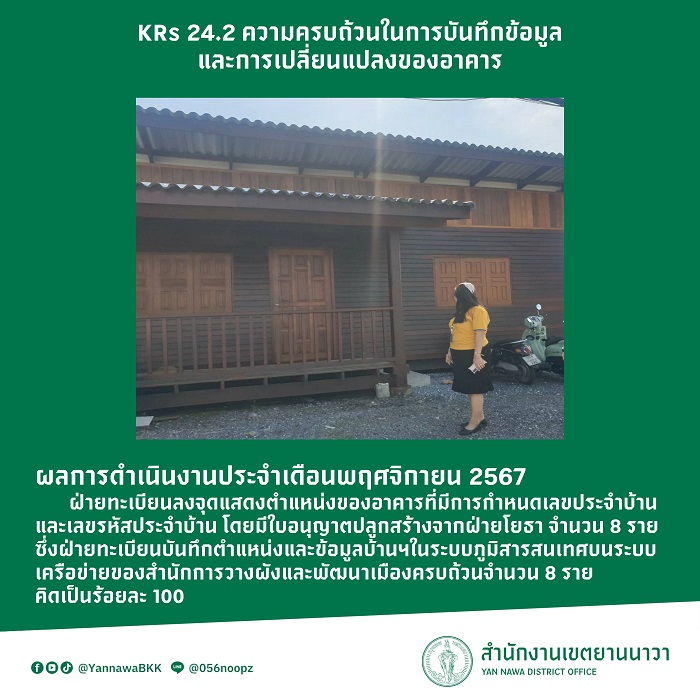 | 5441 | ![]() | 2025-02-25 00:00:00.0000000 | 0.00 | 0.00 | ผลการดำเนินการเฉลี่ยระหว่างฝ่ายโยธา และฝ่ายทะเบียนของสำนักงานเขตยานนาวา มีรายละเอียด ดังนี้ 1. จำนวนข้อมูลสะสมการให้อนุญาตปลูกสร้างอาคารในระบบ BMA OSS ตั้งแต่เดือนมกราคม จนถึงเดือนกุมภาพันธ์ จำนวน 6 คำขอ และจำนวนข้อมูลสะสมการให้อนุญาตปลูกสร้างอาคารจากระบบ BMA OSS ตั้งแต่เดือนมกราคม จนถึงเดือนกุมภาพันธ์ จำนวน 6 คำขอ คิดเป็นร้อยละ 100 2. จำนวนข้อมูลสะสมการออกเลขที่บ้านและเลขรหัสประจำบ้านในระบบของ สวพ. ตั้งแต่เดือนมกราคม จนถึงเดือนกุมภาพันธ์ จำนวน 22 รายการบ้าน และมีจำนวนรายการบ้านสะสมจากระบบทะเบียนราษฎร (สทร.) ตั้งแต่เดือนมกราคม จนถึงเดือนกุมภาพันธ์ จำนวน 30 รายการบ้าน คิดเป็นร้อยละ 73.33 | ||