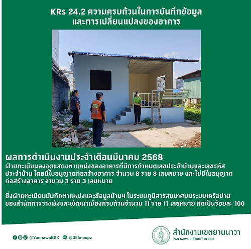 | 5441 | ![]() | 2025-04-25 00:00:00.0000000 | 0.00 | 0.00 | ผลการดำเนินการเฉลี่ยระหว่างฝ่ายโยธา และฝ่ายทะเบียนของสำนักงานเขตยานนาวา มีรายละเอียด ดังนี้ 1. จำนวนข้อมูลสะสมการให้อนุญาตปลูกสร้างอาคารในระบบ BMA OSS ตั้งแต่เดือนมกราคม จนถึงเดือนเมษายน จำนวน 17 คำขอ และจำนวนข้อมูลสะสมการให้อนุญาตปลูกสร้างอาคารจากระบบ BMA OSS ตั้งแต่เดือนมกราคม จนถึงเดือนเมษายน จำนวน 17 คำขอ คิดเป็นร้อยละ 100 2. จำนวนข้อมูลสะสมการออกเลขที่บ้านและเลขรหัสประจำบ้านในระบบของ สวพ. ตั้งแต่เดือนมกราคม จนถึงเดือนเมษายน จำนวน 46 รายการบ้าน และมีจำนวนรายการบ้านสะสมจากระบบทะเบียนราษฎร (สทร.) ตั้งแต่เดือนมกราคม จนถึงเดือนเมษายน จำนวน 48 รายการบ้าน คิดเป็นร้อยละ 95.83 | ||