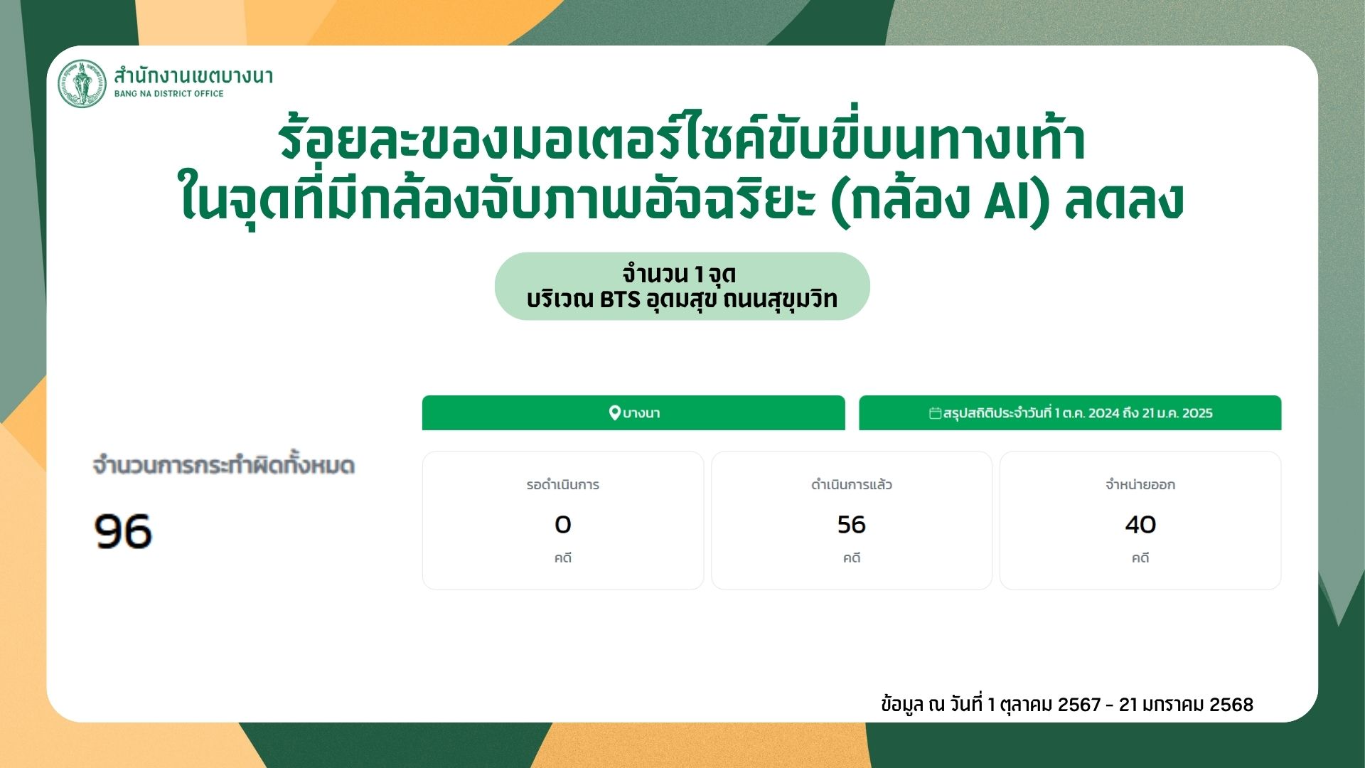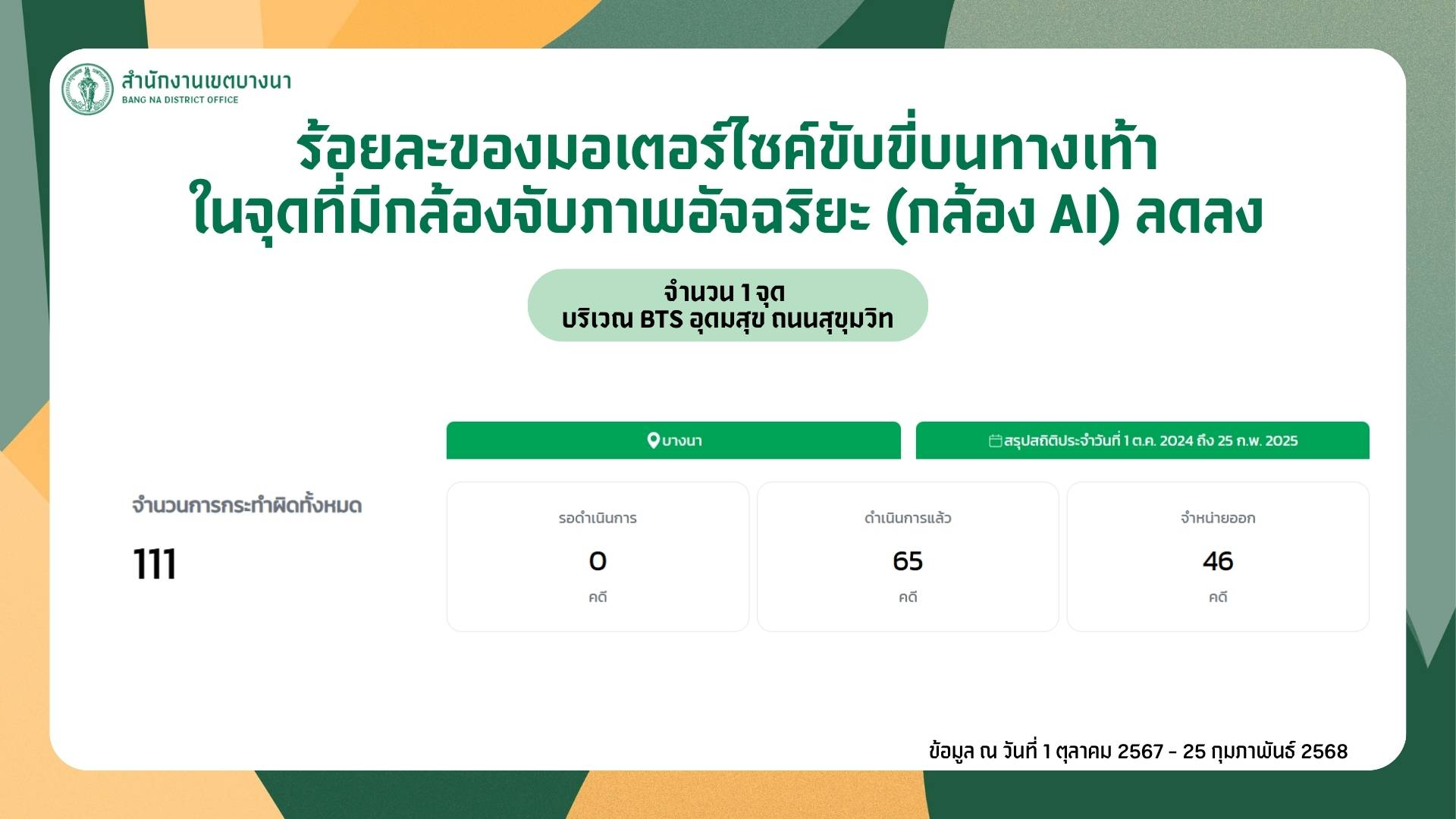 50042025-09-29 00:00:00.000000058.620.00สำนักงานเขตบางนา ได้ดำเนินการตัววัดผลหลัก KRs 1102-2 ตามรายละเอียด แบบ ปผ.กทม.01 ครบถ้วนแล้ว ดังนี้ 1. เจ้าหน้าที่เทศกิจออกตรวจพื้นที่ กวดขัน และประชาสัมพันธ์เกี่ยวกับเรื่องการจอด หรือขับขี่รถยนต์ รถจักรยานยนต์บนทางเท้า 2. กวดขันผู้ฝ่าฝืนจอด หรือขับขี่รถยนต์/รถจักรยานยนต์บนทางเท้า ในจุดที่มีกล้อง AI จำนวน 1 จุด คือบริเวณปากซอยถนนอุดมสุข ผ่านช่องทาง https://bmaai.iboc.co/citylaw 3. จำนวนผู้ฝ่าฝืนจอดหรือขับขี่รถยนต์ รถจักรยานยนต์บนทางเท้า ที่จับได้จากกล้องจับภาพอัจฉริยะ (กล้อง AI) ตั้งแต่เดือนตุลาคม 2567 ถึงเดือนมีนาคม 2568 เท่ากับ 87 ราย (ไม่รวมกรณีภาพซ้ำและการเข็นแทนการขับขี่) 4. จำนวนผู้ฝ่าฝืนจอดหรือขับขี่รถยนต์ รถจักรยานยนต์บนทางเท้า ที่จับได้จากกล้องจับภาพอัจฉริยะ (กล้อง AI) ตั้งแต่เดือนเมษายนถึงเดือนกันยายน 2568 เท่ากับ 36 ราย (ไม่รวมกรณีภาพซ้ำและการเข็นแทนการขับขี่) 5. ร้อยละของผู้ฝ่าฝืนจอดหรือขับขี่รถยนต์ รถจักรยานยนต์บนทางเท้าในจุดที่มีกล้องจับภาพอัจฉริยะ (กล้อง AI) ลดลง ร้อยละ (87-36)/87 x 100 = 58.62 6. รายงานผลการดำเนินงานให้สำนักเทศกิจทราบ ผ่านช่องทางที่กำหนด (Google Sheet)