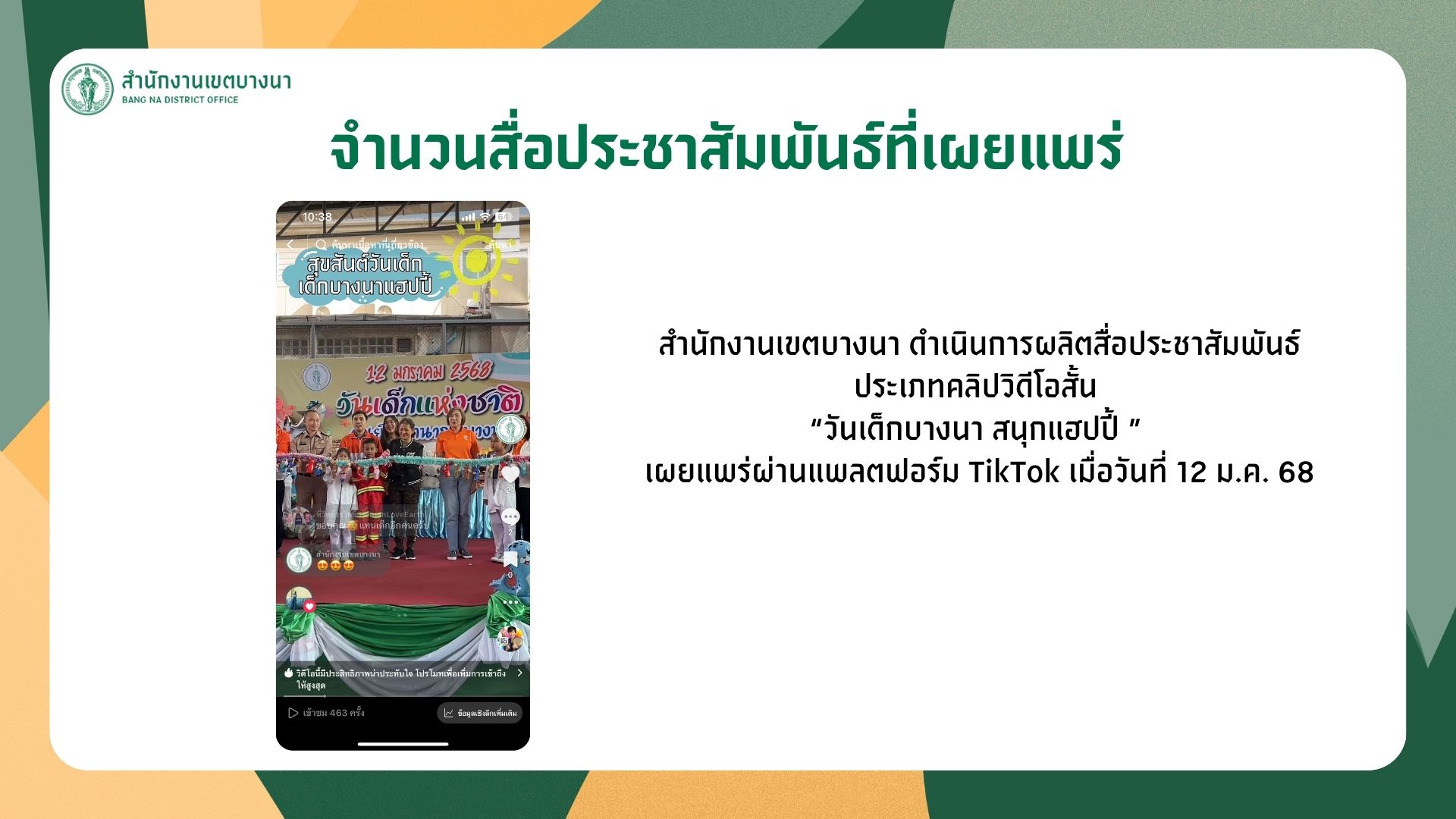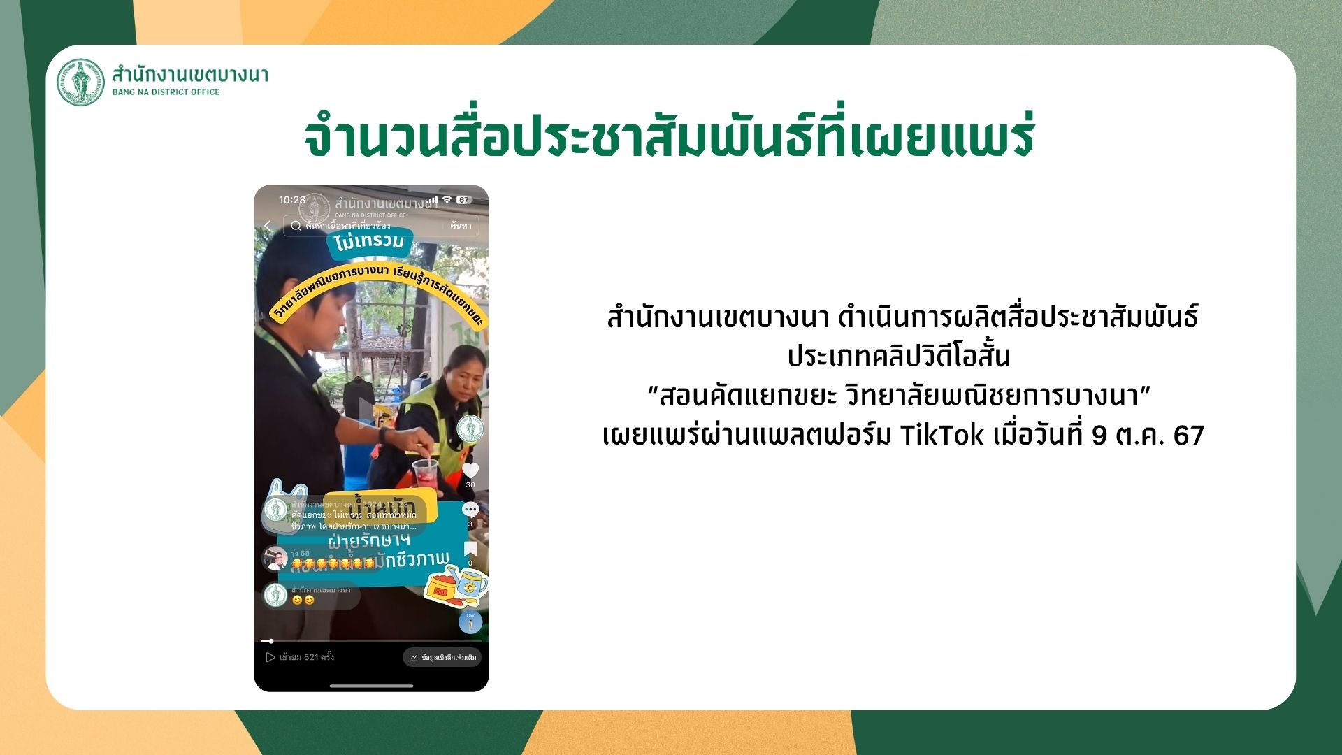 ![]() | - | ผลิตและเผยแพร่สื่อประชาสัมพันธ์ผ่านช่องทางออนไลน์ | 0.00 | 100.00 | สำนักงานเขตบางนา | ฝ่ายปกครอง |