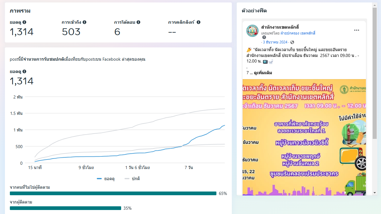 | 5472 |  | 2025-01-14 00:00:00.0000000 | 1,358.00 | 0.00 |  | สำนักงานเขตหลักสี่ ดำเนินการผลิตสื่อประชาสัมพันธ์ “ประกาศวันหยุดเดือนธันวาคม 2567" เผยแพร่ผ่านแพลตฟอร์ม Facebook เมื่อวันที่ 3 ธันวาคม 2567 มียอดดู 1,348 ยอดการโต้ตอบ 10 รวม 1,358 | |