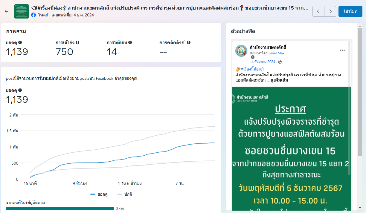 | 5472 |  | 2025-01-24 00:00:00.0000000 | 1,153.00 | 0.00 |  | สำนักงานเขตหลักสี่ ดำเนินการผลิตสื่อประชาสัมพันธ์ “แจ้งปรับปรุงผิวจราจรที่ชำรุด " เผยแพร่ผ่านแพลตฟอร์ม Facebook เมื่อวันที่ 4 ธันวาคม 2567 มียอดดู 1,139 ยอดการโต้ตอบ 14 รวม 1,153 | |