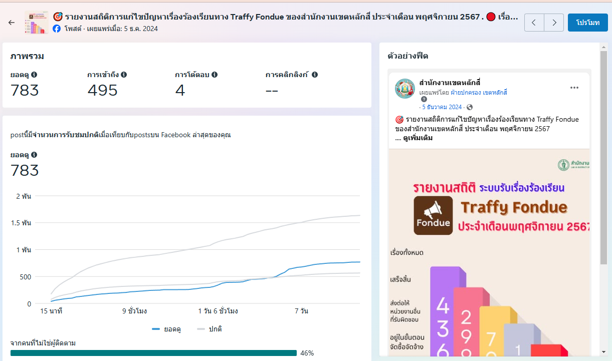 | 5472 |  | 2025-01-24 00:00:00.0000000 | 787.00 | 0.00 |  | สำนักงานเขตหลักสี่ ดำเนินการผลิตสื่อประชาสัมพันธ์ “สถิติการแก้ไขปัญหาเรื่องร้องเรียนทาง Traffy Fondue ประจำเดือน พฤศจิกายน 2567 " เผยแพร่ผ่านแพลตฟอร์ม Facebook เมื่อวันที่ 5 ธันวาคม 2567 มียอดดู 783 ยอดการโต้ตอบ 4 รวม 787 | |