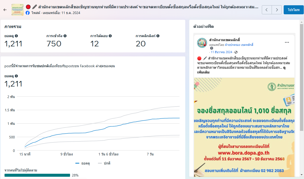 | 5472 |  | 2025-01-24 00:00:00.0000000 | 1,223.00 | 0.00 |  | สำนักงานเขตหลักสี่ ดำเนินการผลิตสื่อประชาสัมพันธ์ “จดทะเบียนตั้งชื่อสกุลหรือตั้งชื่อสกุลใหม่" เผยแพร่ผ่านแพลตฟอร์ม Facebook เมื่อวันที่ 11 ธันวาคม 2567 มียอดดู 1,211 ยอดการโต้ตอบ 12 รวม 1,223 | |