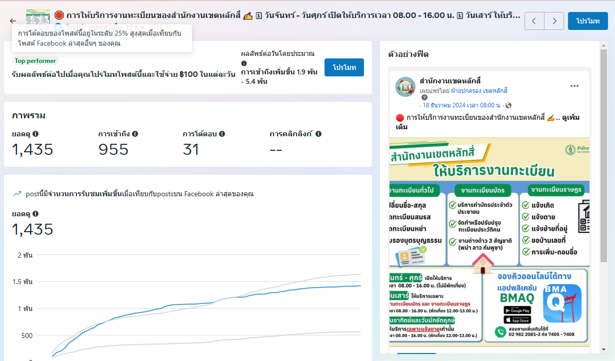 | 5472 |  | 2025-01-24 00:00:00.0000000 | 1,466.00 | 0.00 |  | สำนักงานเขตหลักสี่ ดำเนินการผลิตสื่อประชาสัมพันธ์ “การให้บริการงานทะเบียน" เผยแพร่ผ่านแพลตฟอร์ม Facebook เมื่อวันที่ 18 ธันวาคม 2567 มียอดดู 1,435 ยอดการโต้ตอบ 31 รวม 1,466 | |