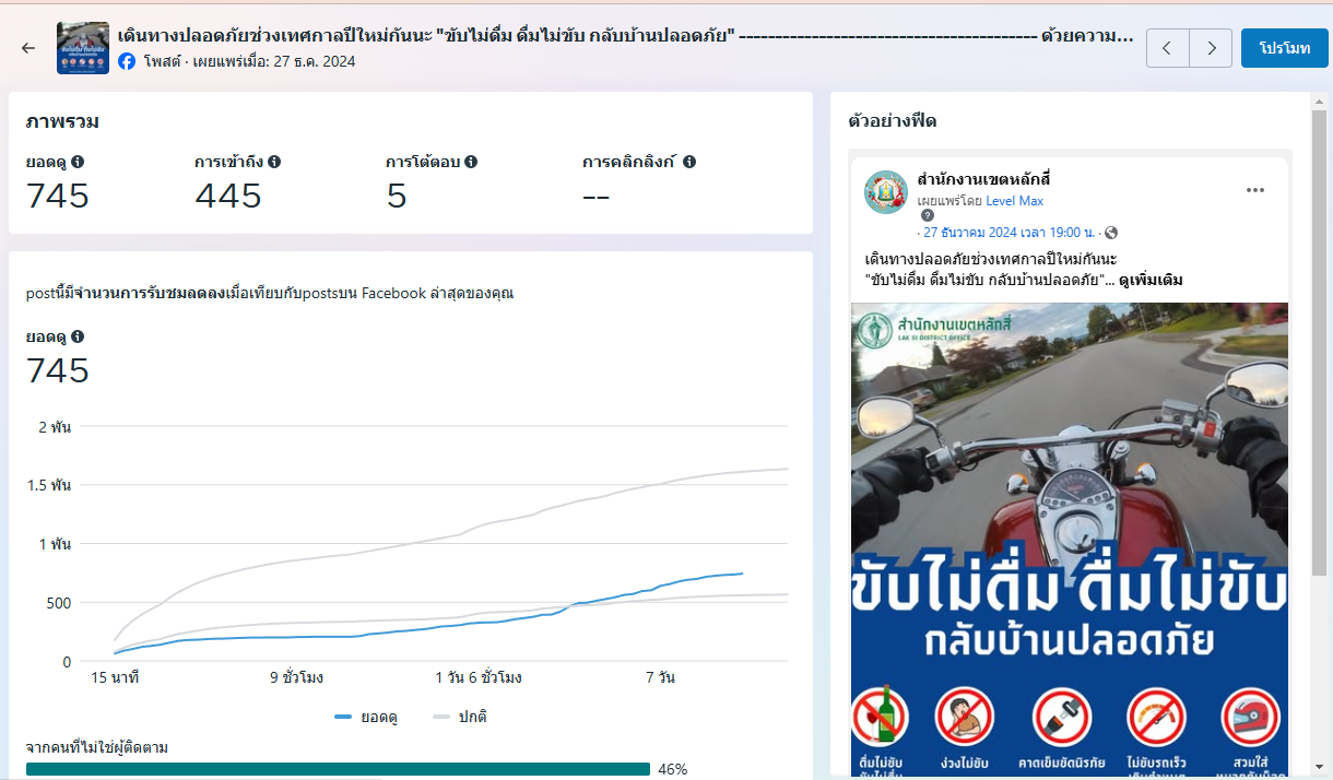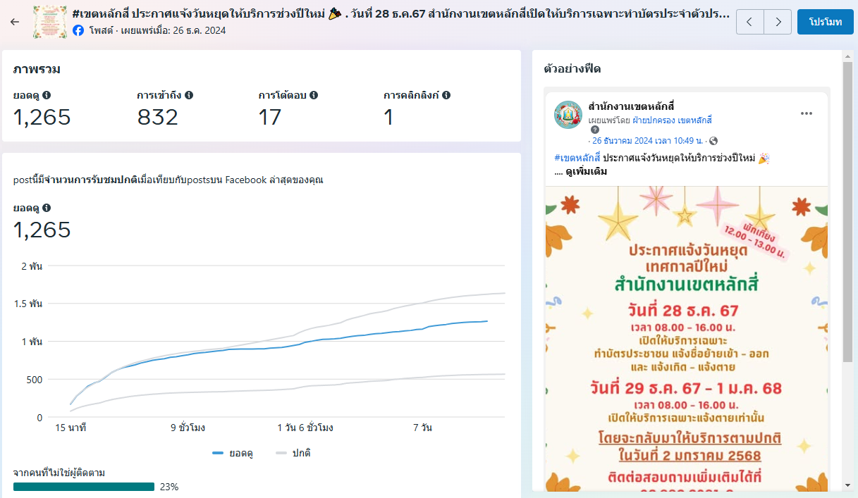 | 5472 |  | 2025-01-24 00:00:00.0000000 | 1,282.00 | 0.00 |  | สำนักงานเขตหลักสี่ ดำเนินการผลิตสื่อประชาสัมพันธ์ “ประกาศแจ้งวันหยุดให้บริการช่วงปีใหม่" เผยแพร่ผ่านแพลตฟอร์ม Facebook เมื่อวันที่ 26 ธันวาคม 2567 มียอดดู 1,265 ยอดการโต้ตอบ 17 รวม 1,282 | |