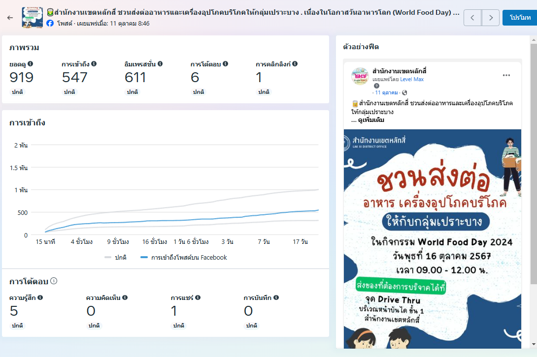 | 5472 | ![]() | 2024-12-11 00:00:00.0000000 | 722.00 | 0.00 | สำนักงานเขตหลักสี่ ดำเนินการผลิตสื่อประชาสัมพันธ์ “ชวนแบ่งปันอาหารให้กลุ่มเปราะบาง โครงการBKK FOOD BANK" เผยแพร่ผ่านแพลตฟอร์ม Facebook เมื่อวันที่ 26 พฤศจิกายน 2567 มียอดดู 715 ยอดการโต้ตอบ 7 รวม 722 | ||