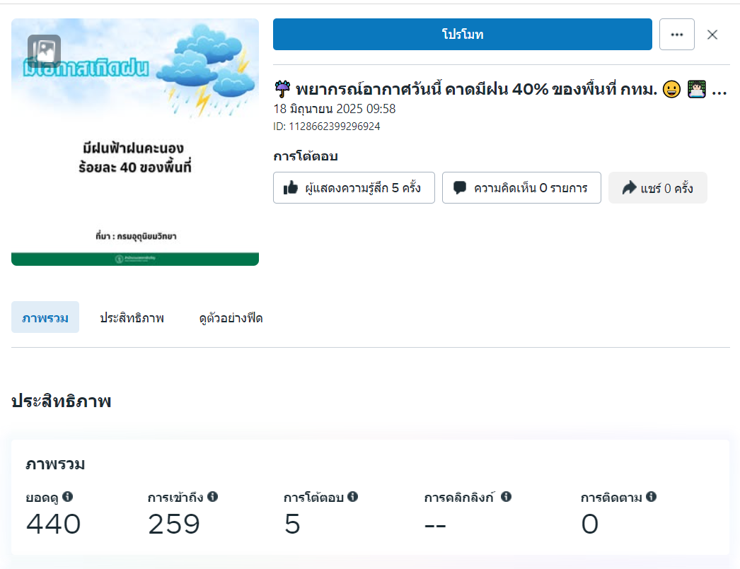 | 5471 | ![]() | 2025-06-29 00:00:00.0000000 | 1.00 | 0.00 | ผลิตสื่อประชาสัมพันธ์ อินโฟกราฟิก คาดการณ์ฝน ผ่านช่องทาง Facebook เมื่อวันที่ 18 มิถุนายน 2568 จำนวนการมีส่วนร่วมกับสื่อประชาสัมพันธ์ที่เผยแพร่ (Engagement) = 445 | ||