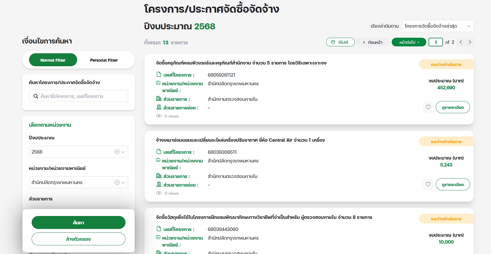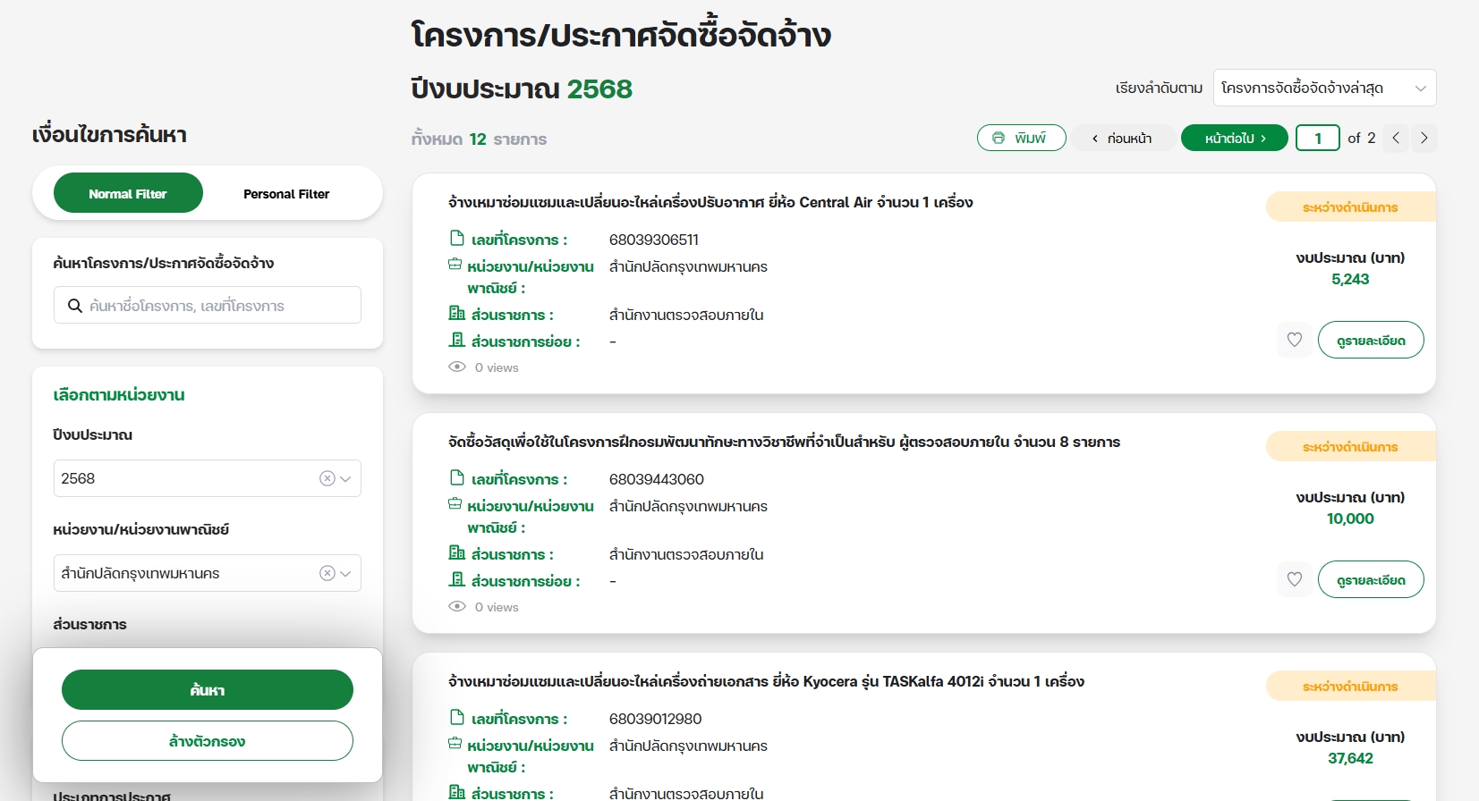 | 5134 | ![]() | 2025-02-25 00:00:00.0000000 | 0.00 | 0.00 | ดำเนินการจัดซื้อจัดจ้างพัสดุ ตามกระบวนการจัดซื้อจัดจ้างที่กำหนด และเผยแพร่ข้อมูลจัดซื้อจัดจ้างผ่านระบบ e-GP BMA อย่างครบถ้วน | ||