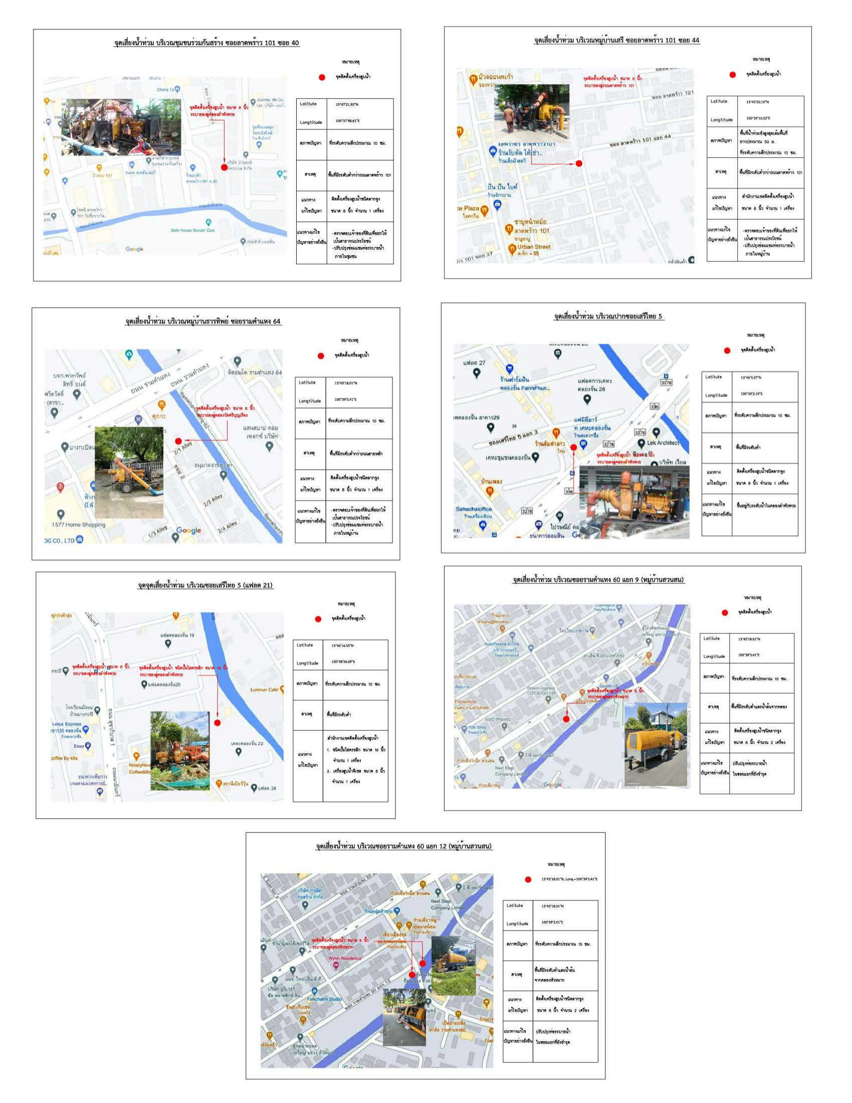 92023-11-30 00:00:00.00000007.000.00ติดตั้งเครื่องสูบน้ำเรียบร้อยแล้วทั้ง 7 จุด 1. ม.เสรี ถ.ลาดพร้าว 101 ซอย 44 2. ชุมชนร่วมกันสร้าง ถ.ลาดพร้าว 101 ซอย 40 3. เคหะคลองจั่น ซ.เสรีไทย 5 4. ซ.เสรีไทย 5 แฟลต 21 5. หมู่บ้านธารทิพย์ ซ.รามคำแหง 64 6. ซ.ราม 60 แยก 9 (หมู่บ้านสวนสน) 7.ซ.ราม 60 แยก 12