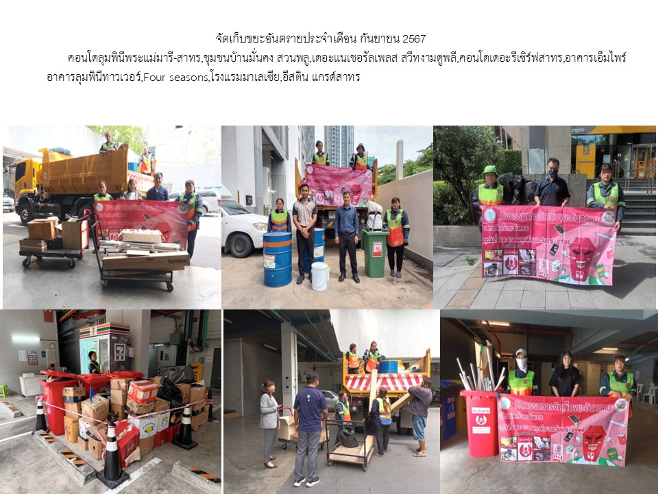 | 586 | ![]() | 2024-04-30 00:00:00.0000000 | 100.00 | 0.00 | จัดเก็บขยะอันตราย เพื่อส่งเสริมและสนับสนุนให้ทุกคนมีส่วนร่วมในการคัดแยกขยะ เพิ่มประสิทธิภาพในการจัดเก็บขยะ รวมทั้งลดปัญหาผลกระทบต่อสิ่งแวดล้อม โดยการนำไปกำจัดที่ถูกวิธี บริเวณอาคารเอ็มไพร์ อาคารคิวเฮ้าส์ สาทร อาคารลุมพินีทาวเวอร์ อาคารกรุงเทพประกันภัย ศูนย์บริการสาธารณสุข 63สมาคมแต้จิ๋วแห่งประเทศไทย ประจำเดือนเมษายน 2567 | ||