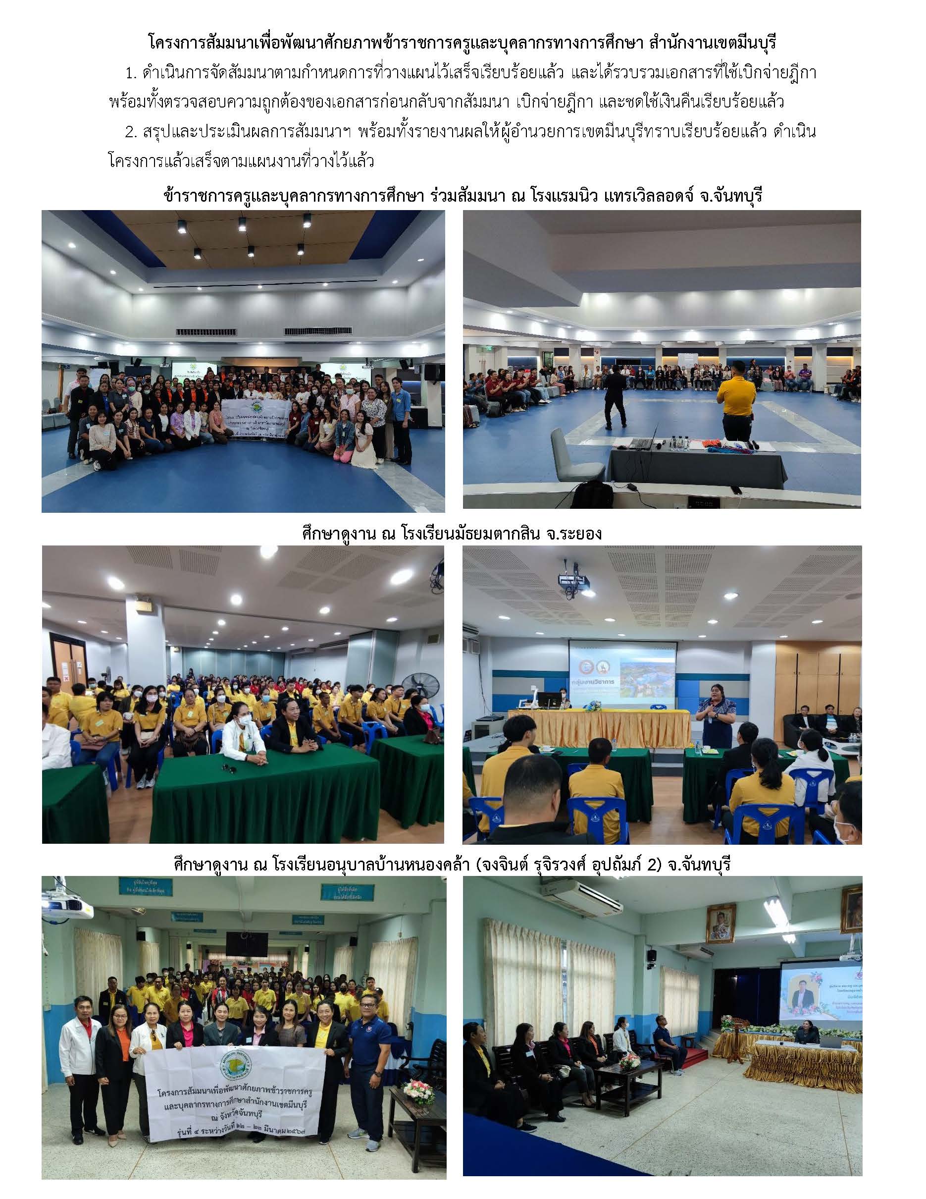 992024-04-25 00:00:00.000000040.000.001. ดำเนินการจัดสัมมนาตามกำหนดการที่วางแผนไว้ และดำเนินการสัมมนาเสร็จเรียบร้อยแล้ว 2. จนท.จัดสัมมนารวบรวมเอกสารที่ใช้เบิกจ่ายฎีกา และตรวจสอบความถูกต้องของเอกสารก่อนกลับจากสัมมนา เพื่อนำมาใช้เบิกจ่ายฎีกา และชดใช้เงินคืน ขณะนี้ได้เบิกจ่ายฎีกา และชดใช้เงินคืนเรียบร้อยแล้ว 3. สรุปและประเมินผลการสัมมนาฯ พร้อมทั้งรายงานผลให้ ผอ.เขตทราบเรียบร้อยแล้ว ดำเนินโครงการแล้วเสร็จตามแผนงานที่วางไว้แล้ว