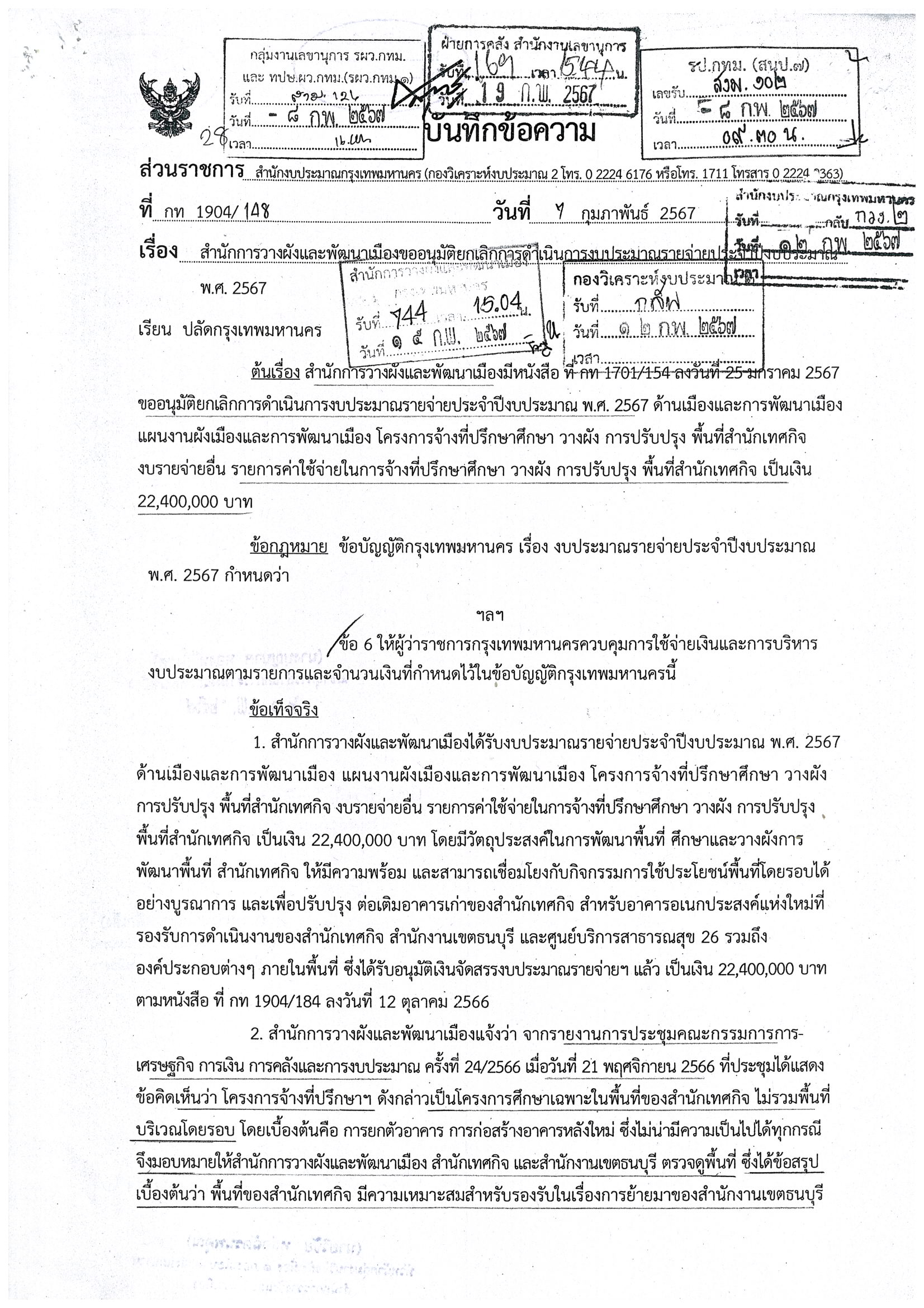4842024-03-22 00:00:00.00000000.000.00สำนักการวางผังและพัฒนาเมืองขออนุมัติยกเลิกการดำเนินการงบประมาณรายจ่ายประจำปีงบประมาณ พ.ศ.2567 รายการค่าใช้จ่ายในการจ้างที่ปรึกษา วางผัง การปรับปรุง พื้นที่สำนักเทศกิจ ตามหนังสือสำนักงบประมาณกรุงเทพมหานคร ที่ กท 1904/148 ลงวันที่ 7 ก.พ.2567