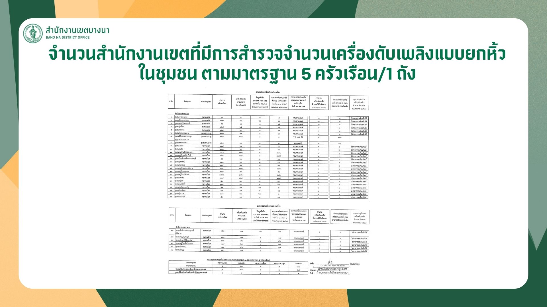 | 5104 |  | 2025-07-24 00:00:00.0000000 | 0.00 | 0.00 |  | สำนักงานเขตบางนา ได้สำรวจจำนวนเครื่องดับเพลิงแบบยกหิ้วในชุมชน ตามมาตรฐาน 5 ครัวเรือน/1 ถัง ครบทุกชุมชนเรียบร้อยแล้ว พร้อมทั้งส่งเอกสารรายงานผลการดำเนินงานให้สำนักป้องกันและบรรเทาสาธารณภัยทราบผ่านทางจดหมายอิเล็กทรอนิกส์ ics2.bfrd199@gmail.com และได้ทำหนังสือรายงานผลตามไปภายหลังเรียบร้อยแล้ว ตามหนังสือสำนักงานเขตบางนา ที่ กท 8401/670 ลงวันที่ 4 กุมภาพันธ์ 2568 | |