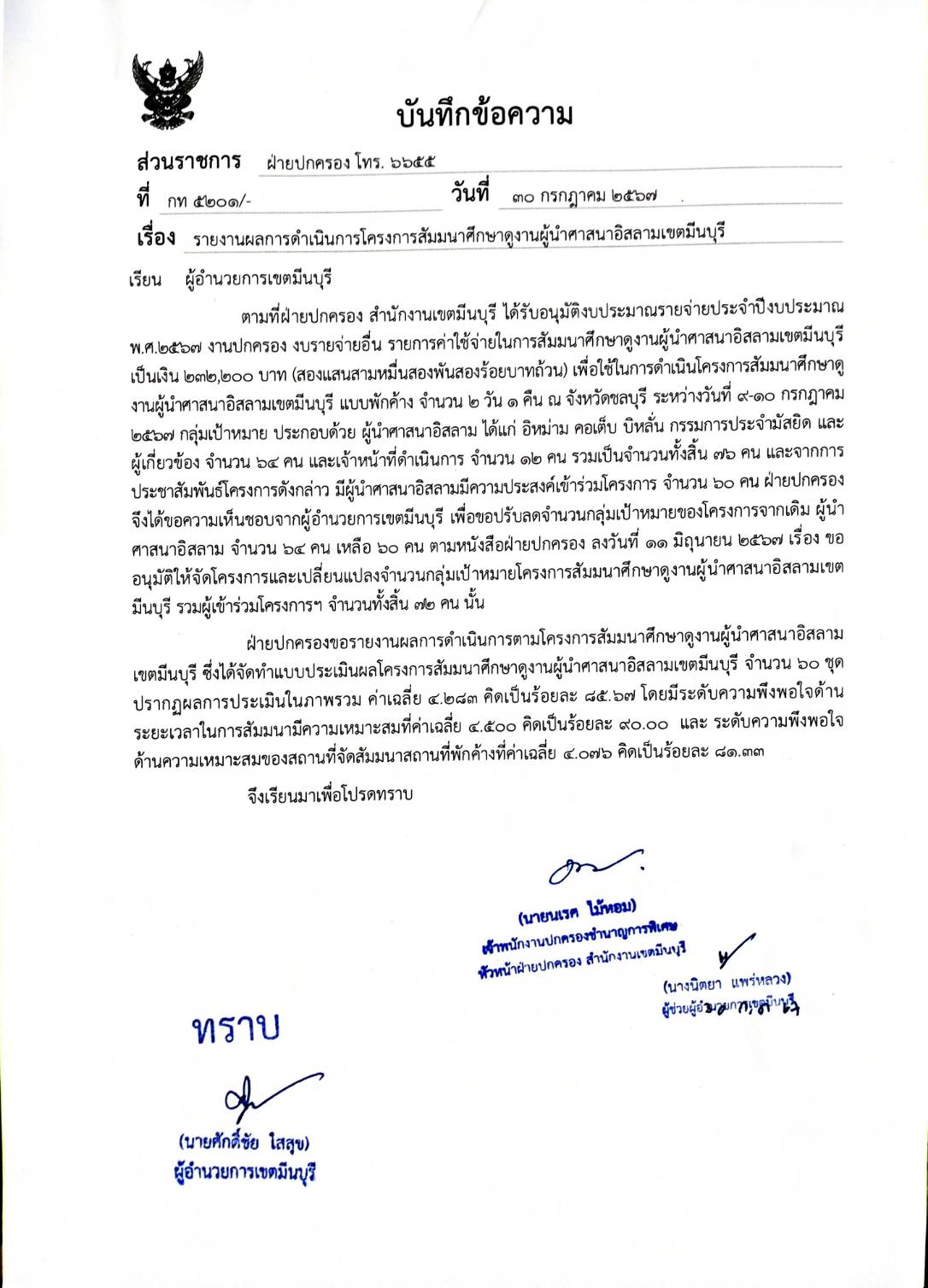 ค่าใช้จ่ายในการสัมมนาศึกษาดูงานผู้นำศาสนาอิสลาม232,200.00100.00สำนักงานเขตมีนบุรีฝ่ายปกครอง