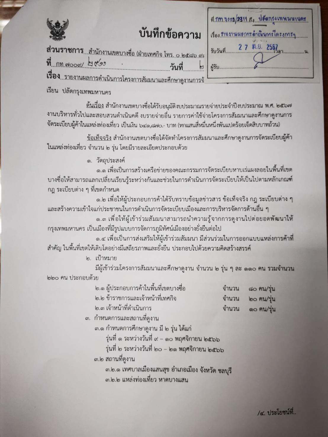 โครงการสัมมนาและศึกษาดูงานการจัดระเบียบผู้ค้าในแหล่งท่องเที่ยว641,870.00100.00สำนักงานเขตบางซื่อฝ่ายปกครอง