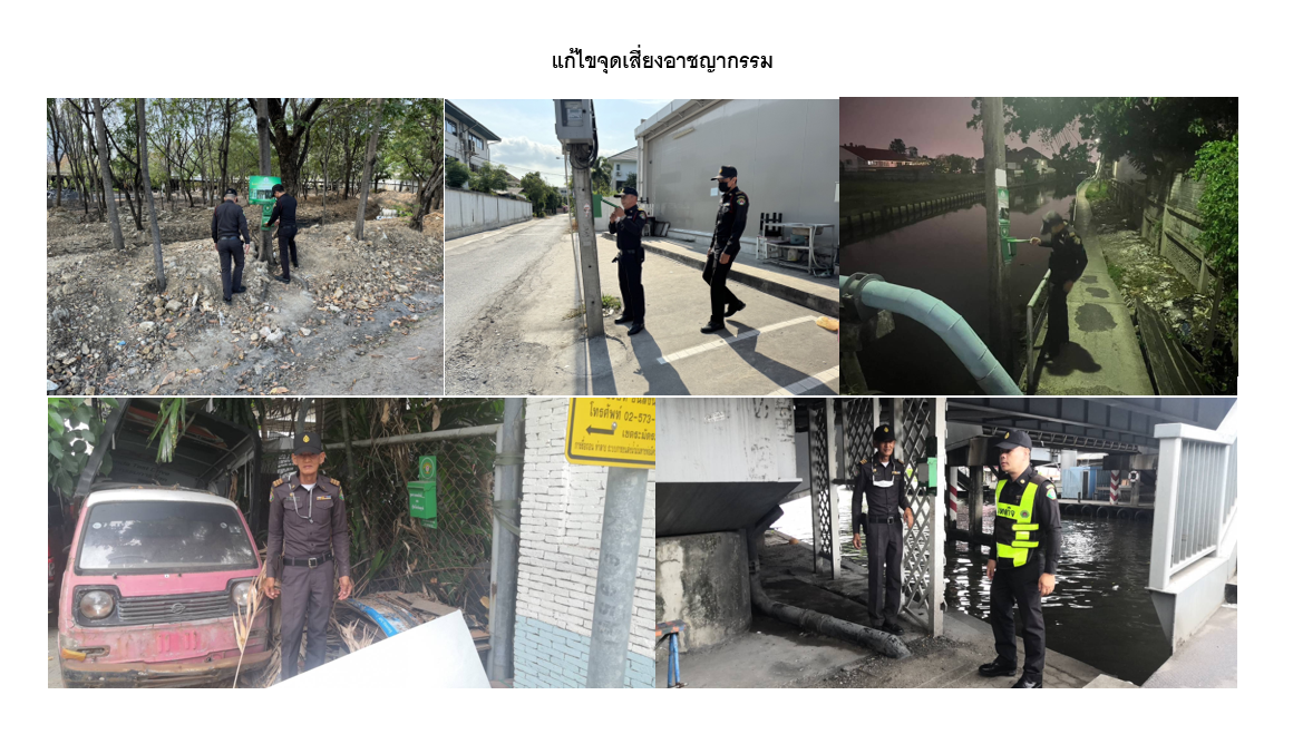 | 12 | ![]() | 2024-01-17 00:00:00.0000000 | 0.00 | 0.00 | - จัดเจ้าหน้าที่ตรวจจุดเสี่ยงอาชญากรรมท้ัง 6 จุด วันละ 2 ครั้ง เช้า/เย็น - รายงานผลผู้บริหารกรุงเทพมหานคร (รองปลัดกรุงเทพมหานคร หัวหน้ากลุ่มภารกิจ) เห็นชอบแผนฯ เมื่อวันที่ 8 มกราคม 2567 ตามหนังสือที่ กท 7701/79 ลงวันที่ 5 มกราคม 2567 - จัดทำรายงานผลการตรวจตามแบบรายงานผลการดำเนินการแก้ไขจุดเสี่ยงภัย (จุดเสี่ยงต่อการเกิดอาชญากรรม) เป็นเอกสารส่งสำนักเทศกิจ ประจำเดือนธันวาคม 2566 ตามหนังสือ ที่ กท 7709/53 ลงวันที่ 4 มกราคม 2567 | ||
