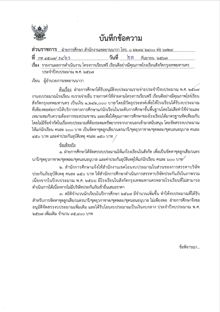 -ค่าใช้จ่ายตามโครงการเรียนฟรี เรียนดีอย่างมีคุณภาพโรงเรียนสังกัดกรุงเทพมหานคร1,242,000.00100.00สำนักงานเขตยานนาวาฝ่ายการศึกษา