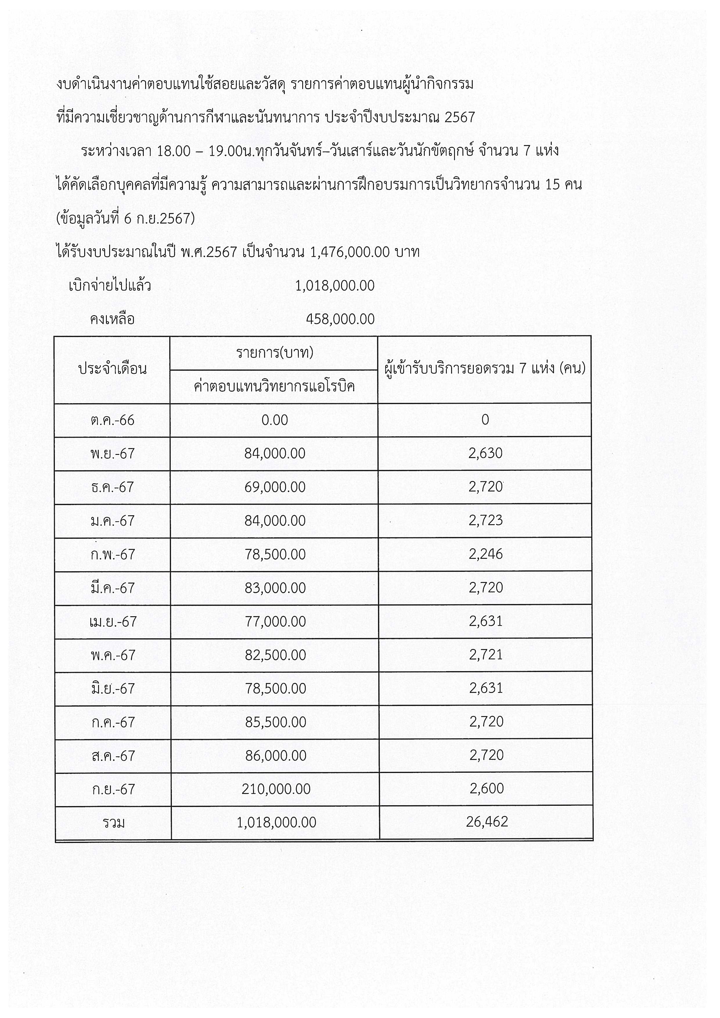 992024-09-13 00:00:00.000000070.000.00เบิกจ่ายค่าตอบแทนวิทยากรแอโรบิค ในปีงบประมาณ พ.ศ. 2567 ตั้งแต่เดือนตุลาคม 2566 - เดือนกันยายน 2567 เป็นจำนวนเงินทั้งสิ้น 1,018,000.-บาท มียอดผู้เข้ารับบริการรวม 26,462 คน