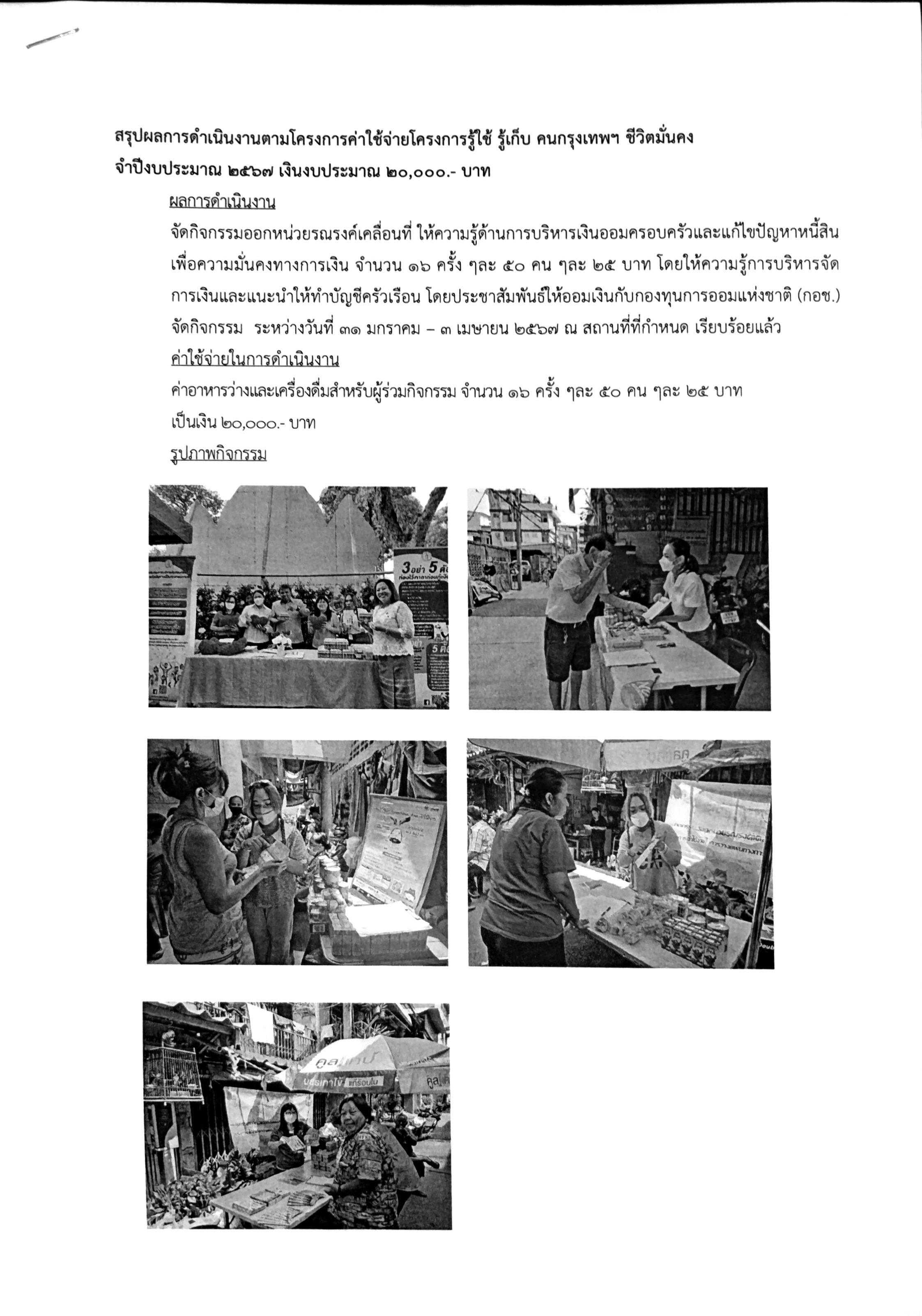 992024-09-05 00:00:00.000000090.000.00จัดกิจกรรมออกหน่วยรณรงค์เคลื่อนที่ ให้ความรู้ด้านการบริหารเงินออมคอรบครัวและแก้ไขปัญหาหนี้สินเพื่อความมั่นคงทางการเงิน จำนวน 16 ครั้ง ครั้งละ 50 คน รวมมีจำนวนผู้ร่วมกิจกรรมทั้งหมด 800 คน (เบิกจ่ายค่าอาหารว่างและเครื่องดื่มสำหรับผู้ร่วมกิจกรรม คนละ 25 บาท เป็นจำนวนเงิน 20,000 บาท) โดยให้ความรู้การบริหารจัดการเงินและแนะนำให้ทำบัญชีครัวเรือน โดยประชาสัมพันธ์ให้ออมเงินกับกองทุนการออมแห่งชาติ (กอช.) จัดกิจกรรมระหว่างวันที่ 31 มกราคม - 3 เมษายน 2567 ณ สถานที่ที่กำหนด