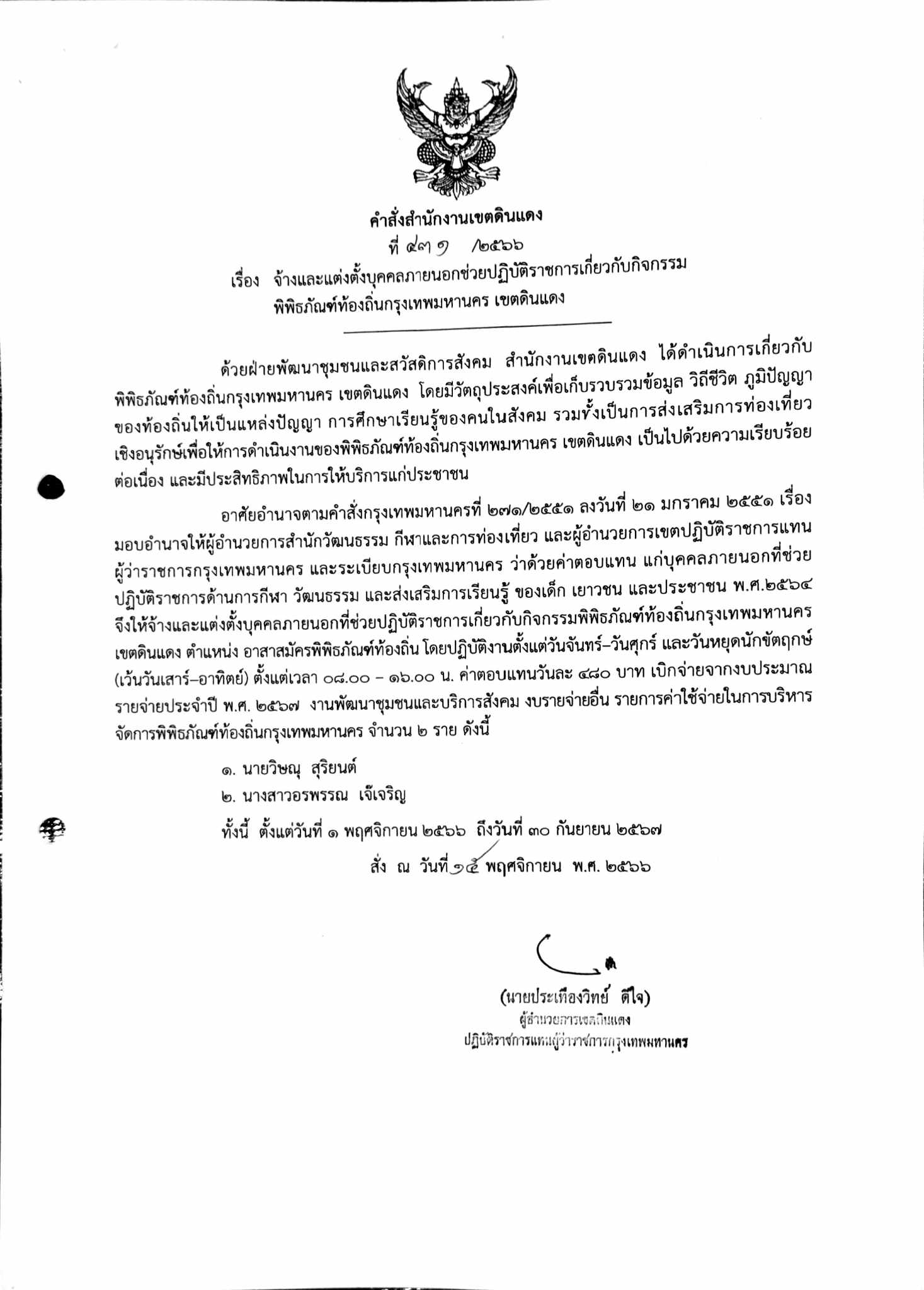 992024-09-04 00:00:00.000000060.000.00จ้างอาสาสมัครพิพิธภัณฑ์จำนวน 2 ราย ได้แก่ 1. นายวิษณุ สุริยนต์ 2. นางสาวอรพรรณ เจ๊เจริญ ตามคำสั่งสำนักงานเขตดินแดงที่ 431/2566 ลว 15 พ.ย. 2566