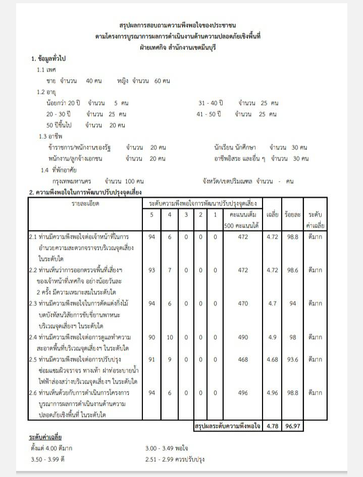 | 12 | ![]() | 2024-06-24 00:00:00.0000000 | 0.00 | 0.00 | ฝ่ายเทศกิจได้ดำเนินการทอดแบบสอบถามความพึงพอใจกับประชาชนผู้สัญจรผ่านไป- มา บริเวณจุดเสี่ยงฯ จำนวน 100 ชุด ผลการดำเนินการปรากฎว่าประชาชนมีความพึงพอใจ ร้อยละ 96.97 | ||