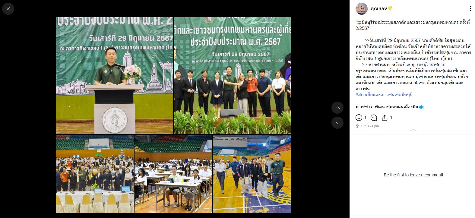 | 99 | ![]() | 2024-09-25 00:00:00.0000000 | 10.00 | 0.00 | - อยู่ระหว่างเบิกจ่ายค่าตอบแทนอาสาสมัครเดือนกันยายน 2567 - เปิดรับสมัครคณะทำงานสภาเด็กและเยาวชนเขตมีนบุรี เพื่อเป็นกำลังช่วยเสริมในการขับเคลื่อนการทำงานของสภาเด็กฯ เขตมีนบุรี | ||