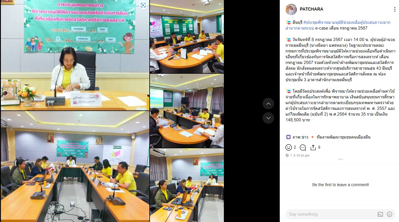 - วันที่ 8 ก.ค. 67 จัดการประชุมพิจารณาอนุมัติให้ความช่วยเหลือ ด้านค่าใช้จ่ายในการจัดสวัสดิการและการสงเคราะห์ ประจำเดือน กรกฎาคม 2567 จำนวน 35 ราย เป็นเงิน 148,500 บาท ได้แก่ ทุนช่วยเหลือค่ารักษาพยาบาล จำนวน 22 ราย (99,000 บาท) ทุนสนับสนุนกิจกรรมทางการศึกษา 8 ราย (26,000 บาท) และสนับสนุนทุนประกอบอาชีพผู้ประสบภาวะยากลำบาก จำนวน 5 ราย (23,500 บาท)