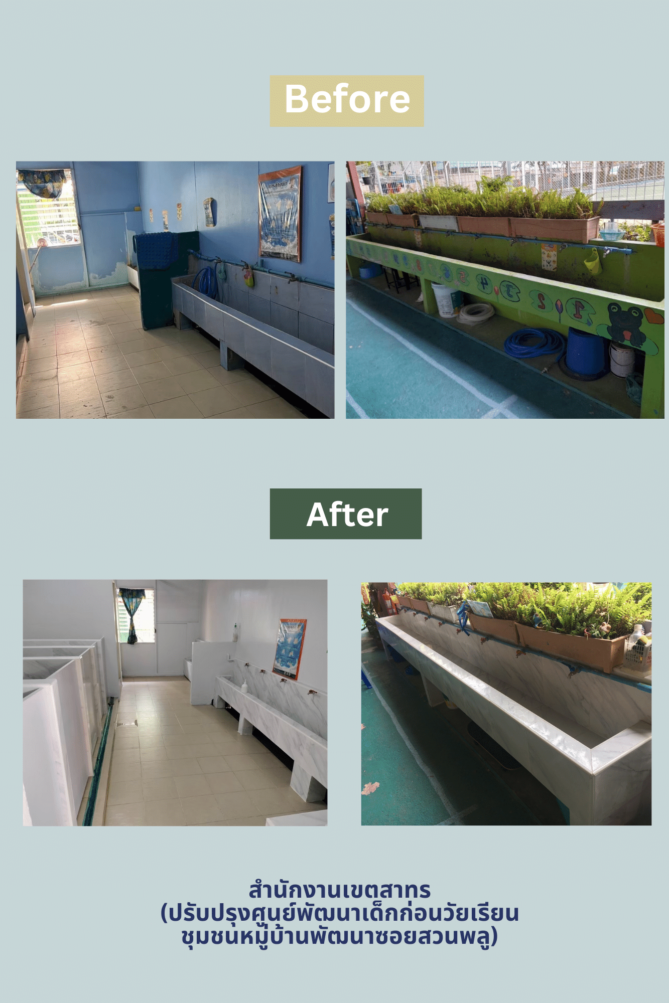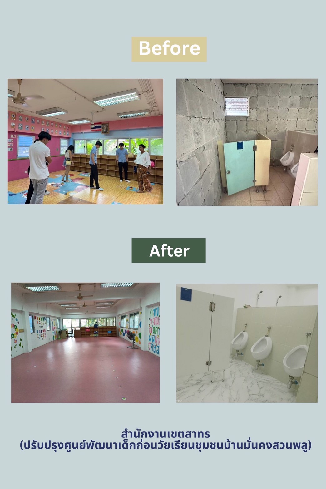 1. ชื่อศูนย์เด็กเล็กที่ปรับปรุง ศูนย์พัฒนาเด็กก่อนวัยเรียนชุมชนบ้านมั่นคงสวนพลู 2. รายละเอียดการปรับปรุง บริเวณห้องเรียนชั้น อ.1 และห้องน้ำ (217,591 บาท) (มูลนิธิทีนเวิร์คสนับสนุน)