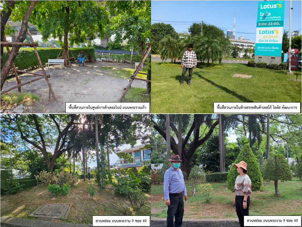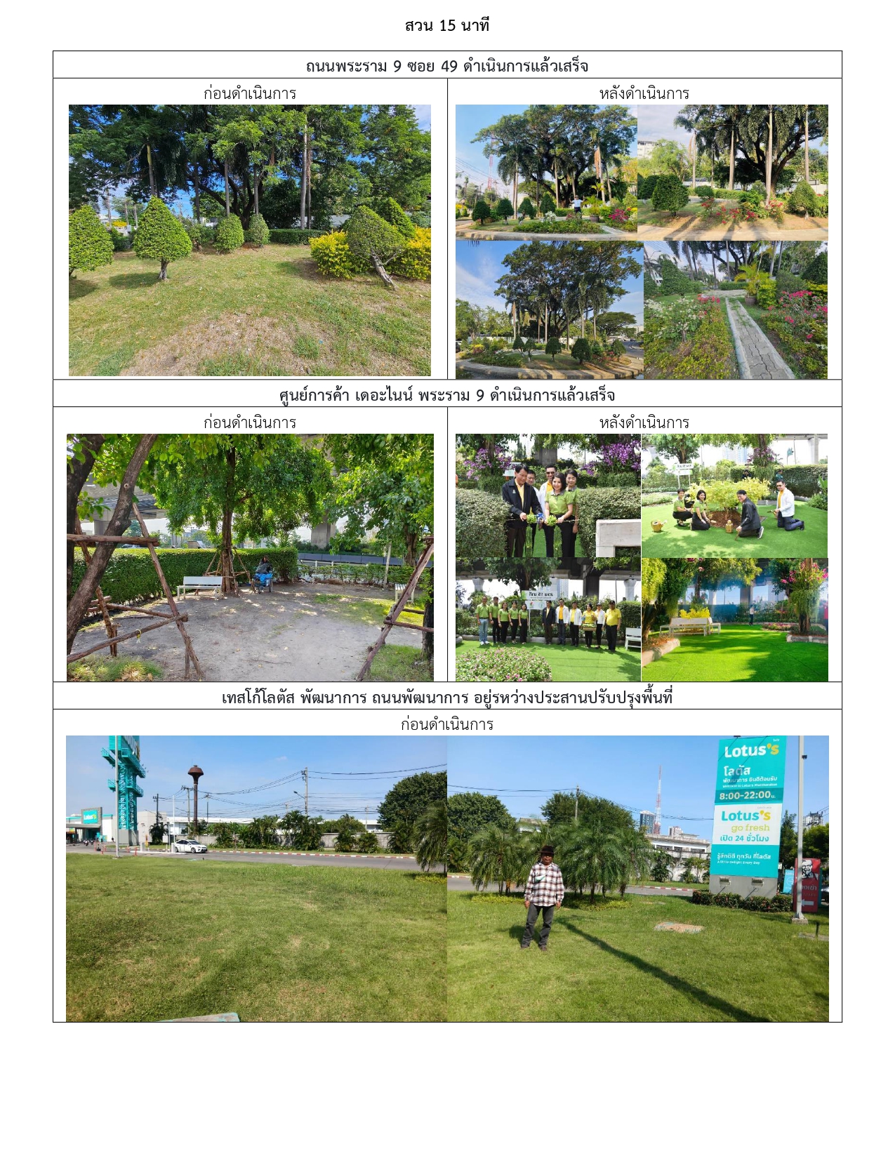 32024-01-26 00:00:00.00000000.000.001. ถนนพระราม 9 ซอย 49 ดำเนินการปลูกไม้ดอกไม้ประดับภายในสวน 2. ศูนย์การค้า เดอะไนน์ พระราม 9 อยู่ระหว่างห้างเดอะไนน์ดำเนินการจัดซื้อต้นไม้ วัสดุอุปกรณ์จัดสวน 3. เทสโก้โลตัส พัฒนาการ ถนนพัฒนาการ อยู่รหว่างประสานปรับปรุงพื้นที่