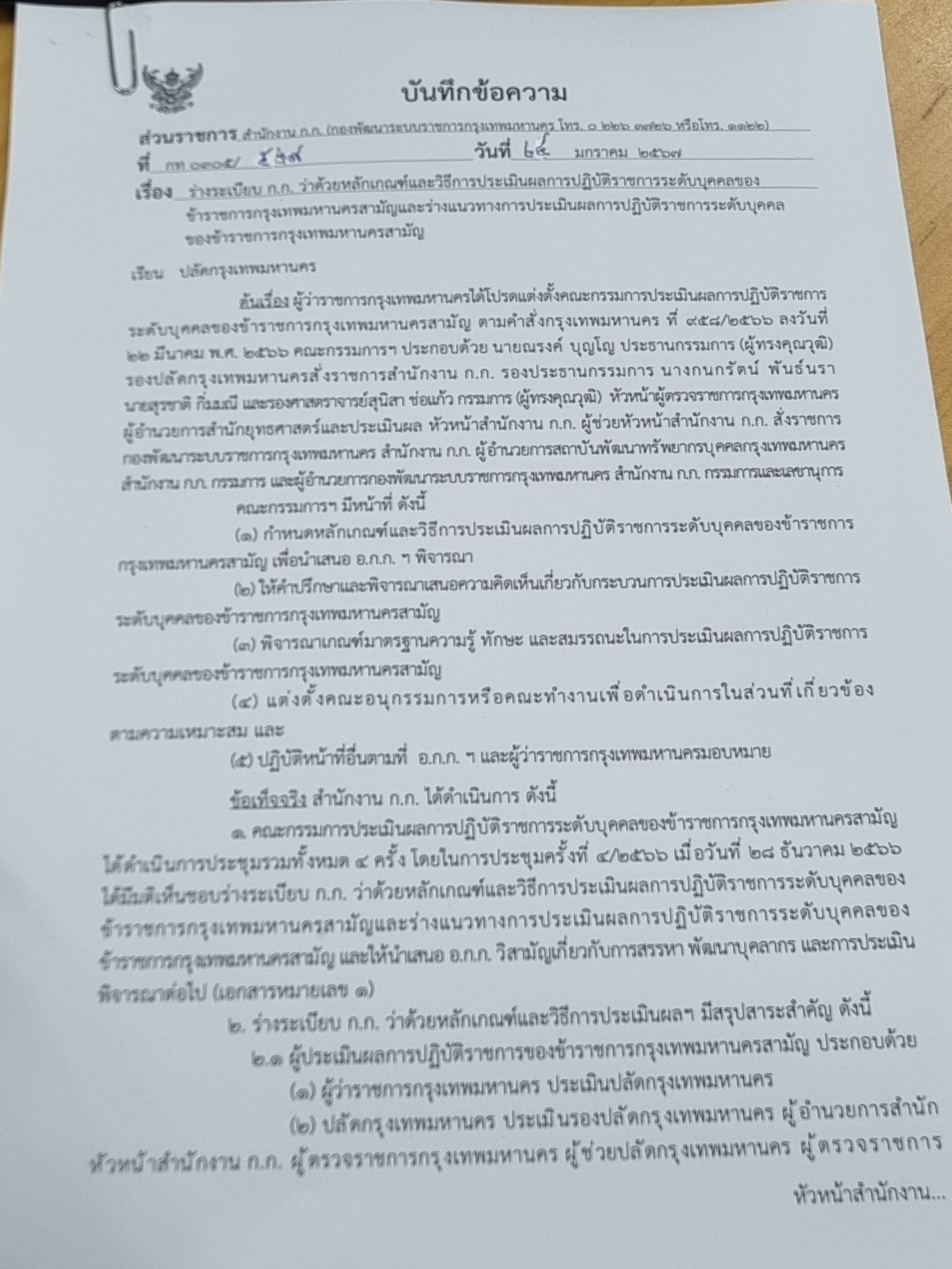 | 140 |  | 2024-08-22 00:00:00.0000000 | 0.00 | 0.00 |  | 1. ให้หน่วยงานทดลองประเมินผลการปฏิบัติราชการระดับบุคคลของข้าราชการกรุงเทพมหานครสามัญ ตามปฏิทินกิจกรรมและแนวทางปฏิบัติที่กำหนด (รายละเอียดตามหนังสือสำนักงาน ก.ก. ที่ กท 0305/5545 ลงวันที่ 31 ก.ค. 2567)