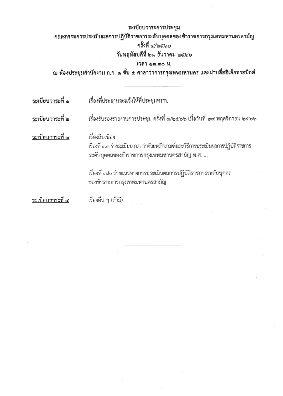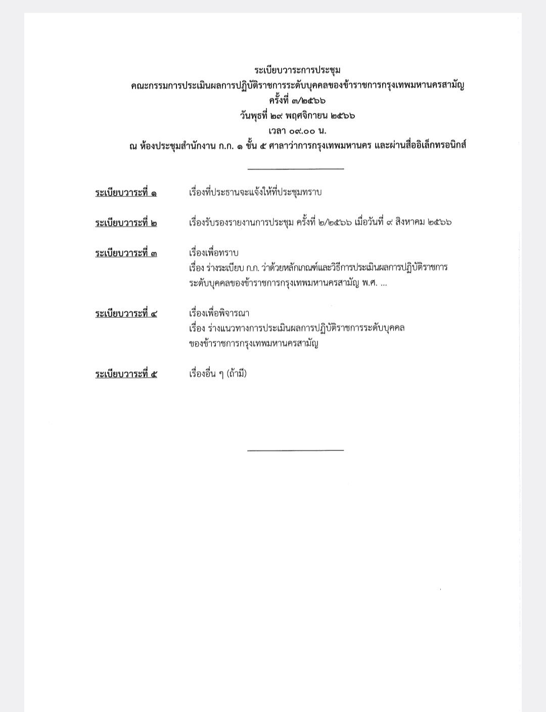 | 140 |  | 2023-11-24 00:00:00.0000000 | 0.00 | 0.00 |  | - จัดทำระเบียบวาระการประชุมคณะกรรมการประเมินผลการปฏิบัติราชการระดับบุคคลของข้าราชการกรุงเทพมหานครสามัญ ครั้งที่ 3/2566 เรียบร้อยแล้ว - กำหนดการประชุมคณะกรรมการฯ ครั้งที่ 3/2566 ในวันพุธที่ 29 พฤศจิกายน 2566 เพื่อนำเสนอร่างหลักเกณฑ์และวิธีการประเมินผลฯ พิจ | |