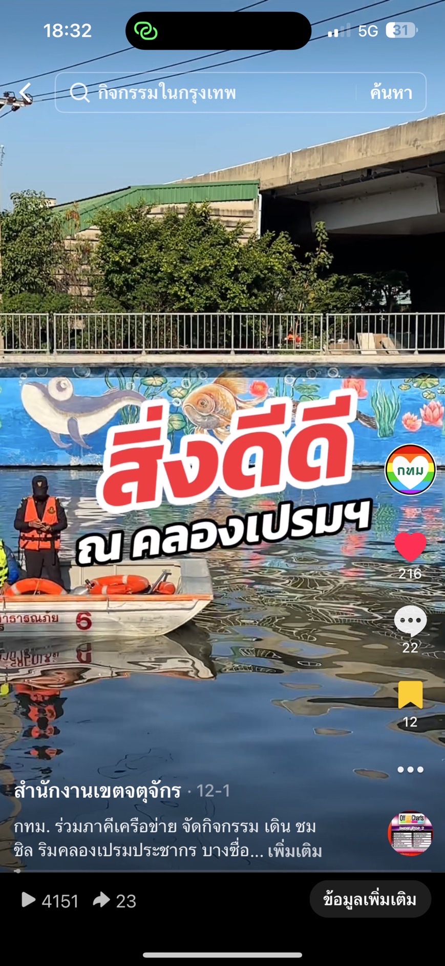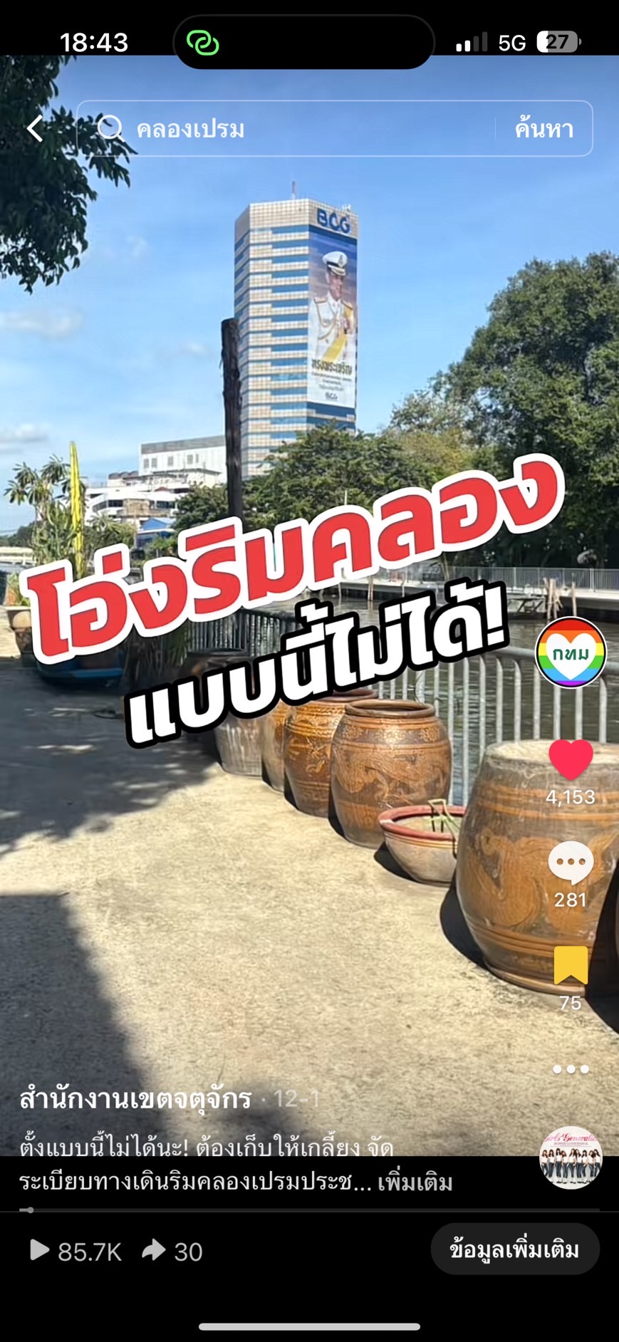 | 5471 |  | 2024-12-12 00:00:00.0000000 | 1.00 | 0.00 |  | สำนักงานเขตจตุจักร ดำเนินการผลิตสื่อประชาสัมพันธ์ ประเภท คลิปวิดีโอสั้นโอ่งริมคลอง….แบบนี้ไม่ได้ จัดระเบียบทางเดิน ริมคลองเปรมประชากร เผยแพร่ผ่านแพลตฟอร์ม TikTok เมื่อวันที่ 1 ธันวาคม 2567 | |