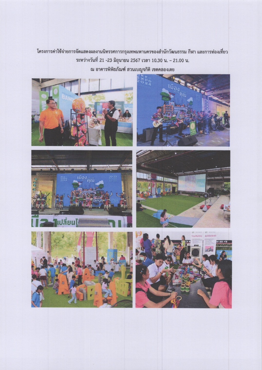 โครงการค่าใช้จ่ายในการจัดแสดงผลงานนิทรรศการกรุงเทพมหานคร ของสำนักวัฒนธรรม กีฬา และการท่องเที่ยว 500,000.00100.00สำนักวัฒนธรรม กีฬาและการท่องเที่ยวกลุ่มงานแผนงานและประเมินผล