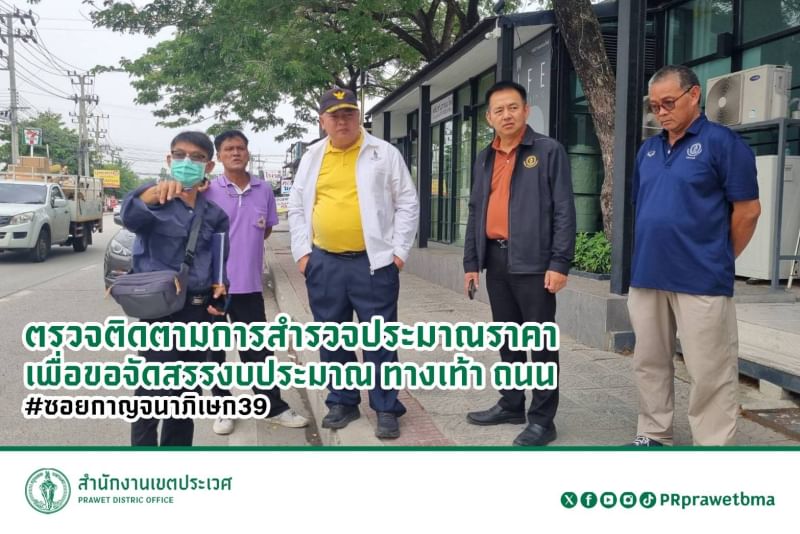 42024-03-29 00:00:00.00000000.000.00นายดิชา คงศรี ผู้อำนวยการเขตประเวศ พร้อมด้วย หัวหน้าฝ่ายโยธาลงพื้นที่ตรวจติดตามการดำเนินการสำรวจประมาณราคาเพื่อขอจัดสรรงบประมาณปรับปรุง ทางเท้าและถนนชำรุด ณ บริเวณ ซอยกาญจนาภิเษก39 แขวงดอกไม้ เขตประเวศ ทั้งนี้ เพื่อความปลอดภัยในชีวิตและทรัพย์สินของประชาชน