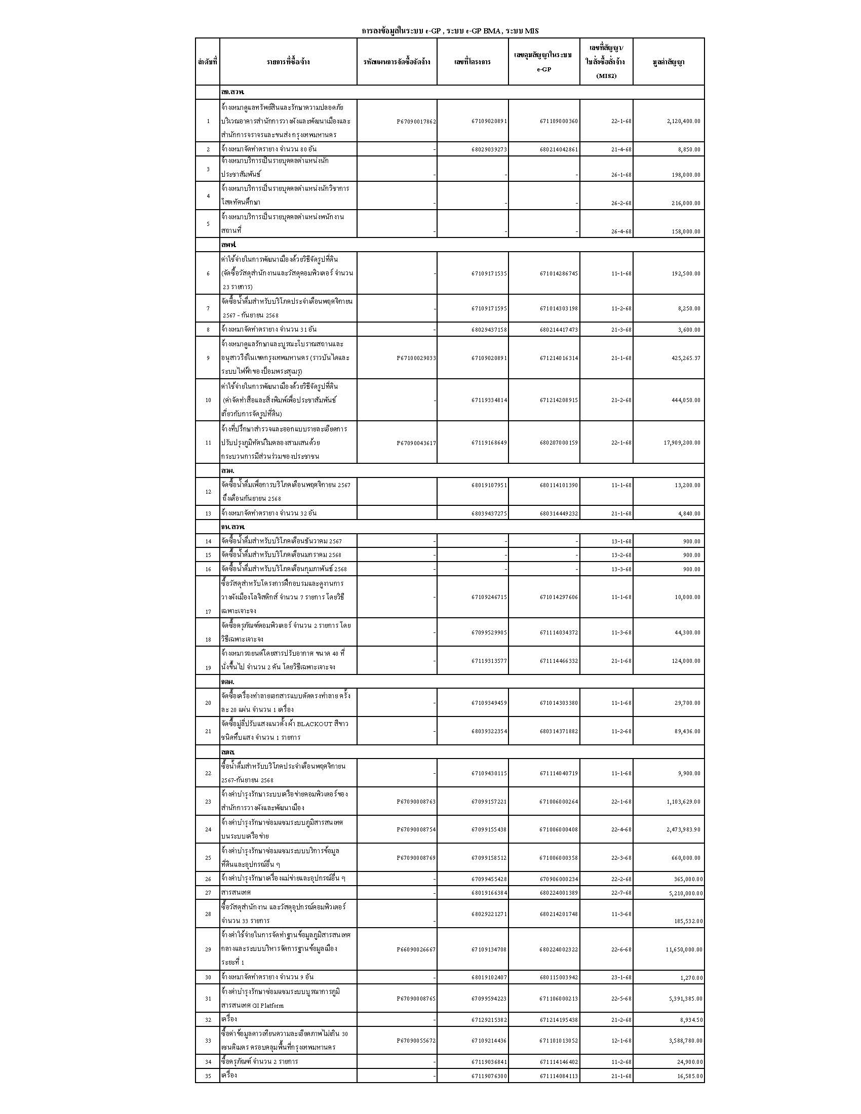 | 5134 | ![]() | 2025-04-25 00:00:00.0000000 | 8.35 | 0.00 | ส่วนราชการในสังกัดบันทึกข้อมูลรายการ/โครงการในการดำเนินการจัดซื้อจัดจ้างครบถ้วนทุกระบบงานที่เกี่ยวข้องกับ ระบบ e-GP ระบบ e-GP BMA และ ระบบ MIS จำนวน 35 รายการ - ระบบ e-GP BMA และระบบ MIS จำนวน 35 รายการ/โครงการ - ระบบ e-GP จำนวน 29 รายการ/โครงการ | ||