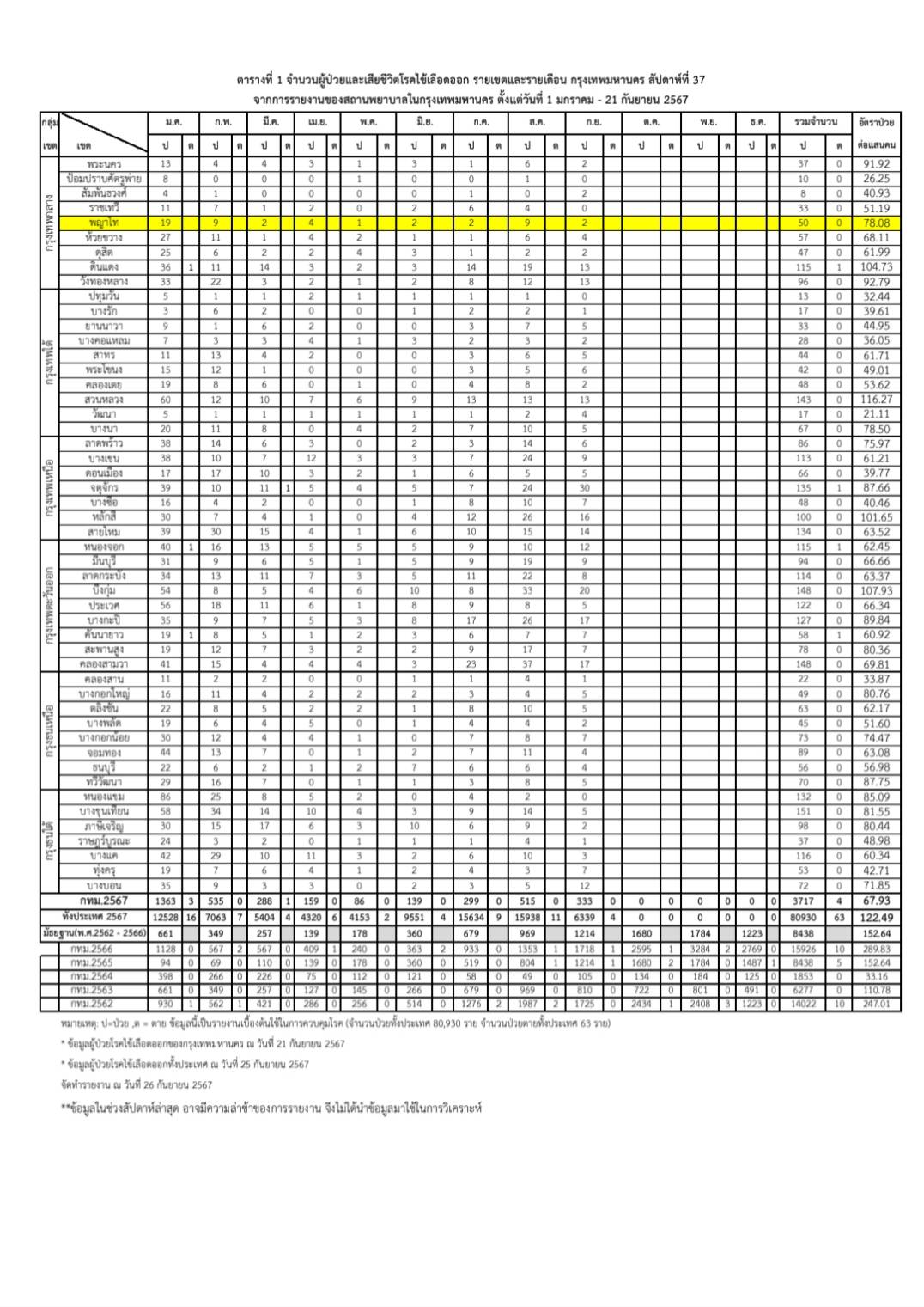 6852024-09-30 00:00:00.00000000.000.00ข้อมูลจากสำนักอนามัย ณ วันที่ 21 กันยายน 2567 ข้อมูลผู้ป่วยไข้เลือดออกในพื้นที่เขตพญาไท จำนวน 50 คน อัตราป่วยคิดเป็น 78.08 ต่อแสนประชากร