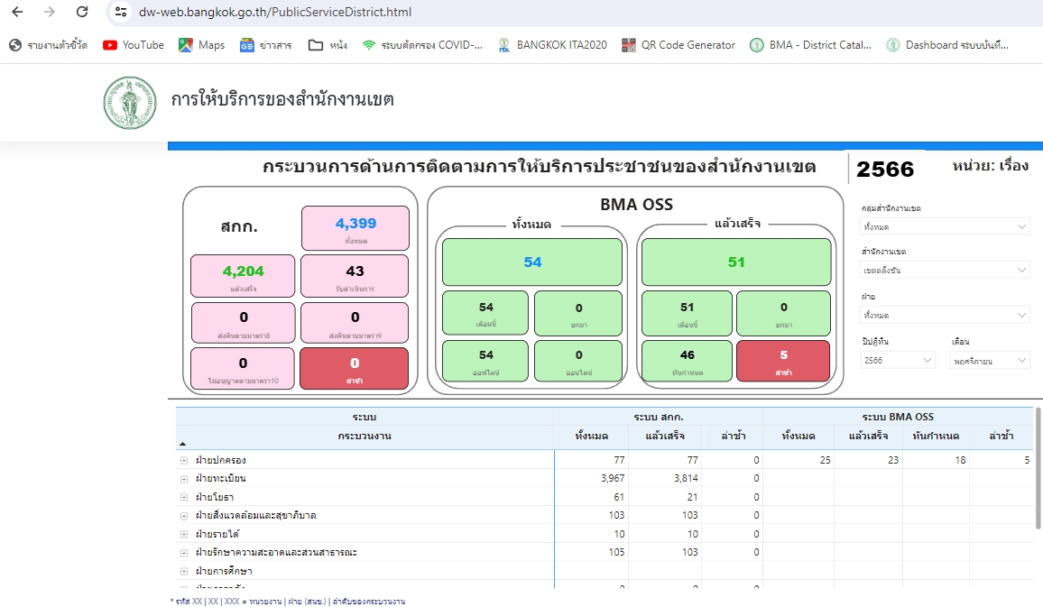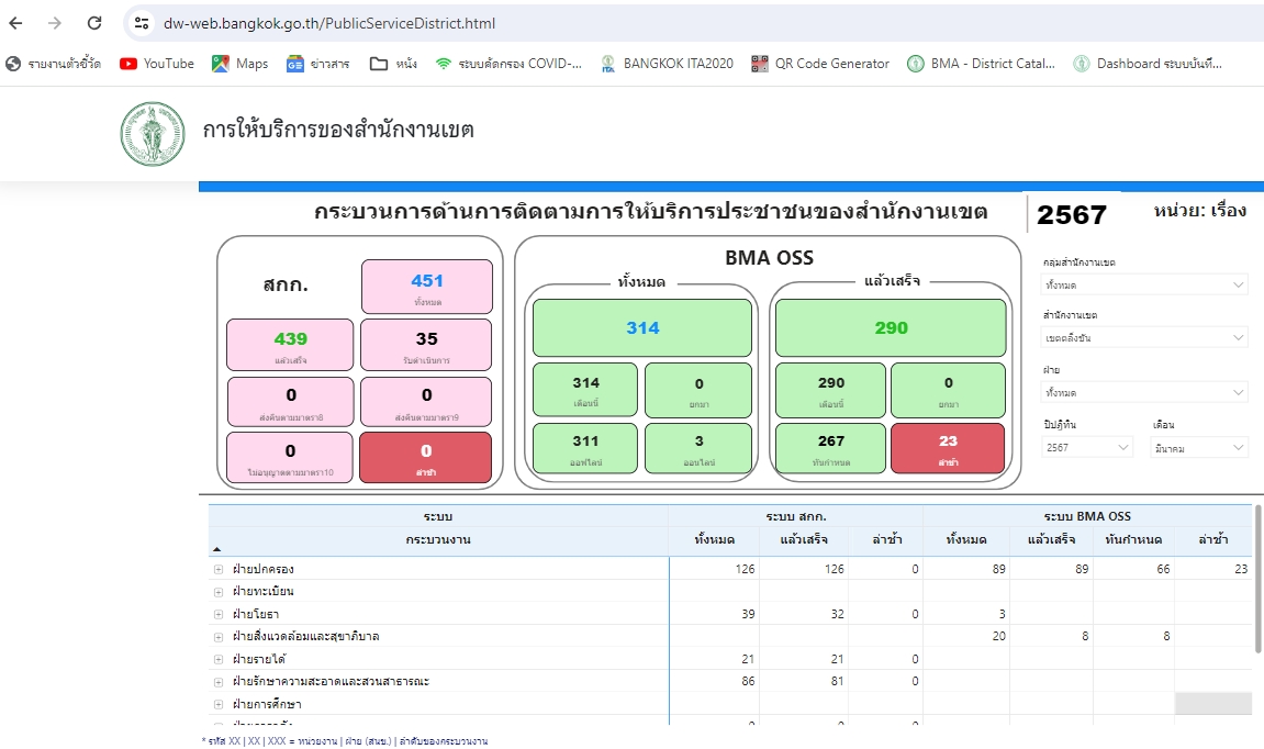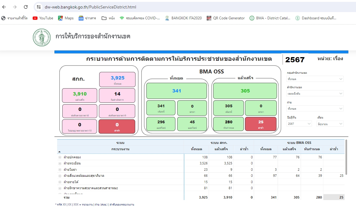 | 1414 | ![]() | 2024-08-23 00:00:00.0000000 | 0.00 | 0.00 | - เดือนกรกฎาคม 2567 มีจํานวนคำขอรับบริการตามกระบวนงานในระบบศูนย์รับคําขออนุญาตของกรุงเทพมหานคร (BMA OSS) ได้แก่ Online 33 คำขอ Offline 151 คำขอ รวมทั้งหมด 184 คำขอ | ||