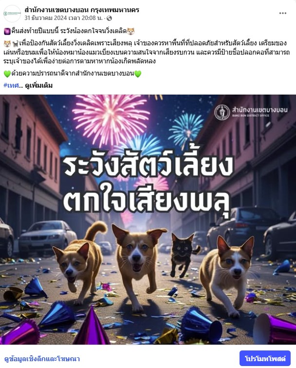 | 5471 |  | 2025-01-13 00:00:00.0000000 | 1.00 | 0.00 |  | สำนักงานเขตบางบอน จัดทำสื่อประชาสัมพันธ์ "ระวังสัตว์เลี้ยงตกใจเสียงพลุ" เผยแพร่บนสื่อสังคมออนไลน์ Facebook Fanpage สำนักงานเขตบางบอนกรุงเทพมหานคร เมื่อวันที่ 31 ธันวาคม 2567 | |