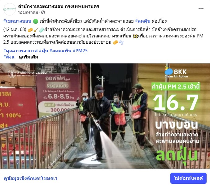 | 5471 |  | 2025-02-25 00:00:00.0000000 | 1.00 | 0.00 |  | สำนักงานเขตบางบอน จัดทำสื่อประชาสัมพันธ์ "ล้างทำความสะอาดลดฝุ่น" เผยแพร่บนสื่อสังคมออนไลน์ Facebook Fanpage สำนักงานเขตบางบอนกรุงเทพมหานคร เมื่อวันที่ 12 มกราคม 2568 | |