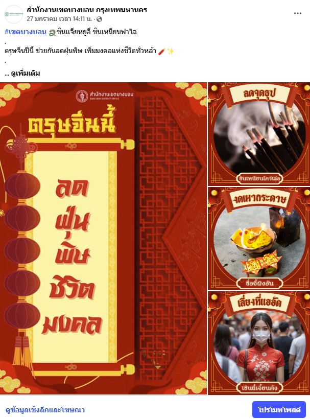 | 5471 |  | 2025-02-25 00:00:00.0000000 | 1.00 | 0.00 |  | สำนักงานเขตบางบอน จัดทำสื่อประชาสัมพันธ์ "รณรงค์ลดฝุ่นช่วงเทศกาลตรุษจีน" เผยแพร่บนสื่อสังคมออนไลน์ Facebook Fanpage สำนักงานเขตบางบอนกรุงเทพมหานคร เมื่อวันที่ 27 มกราคม 2568 | |