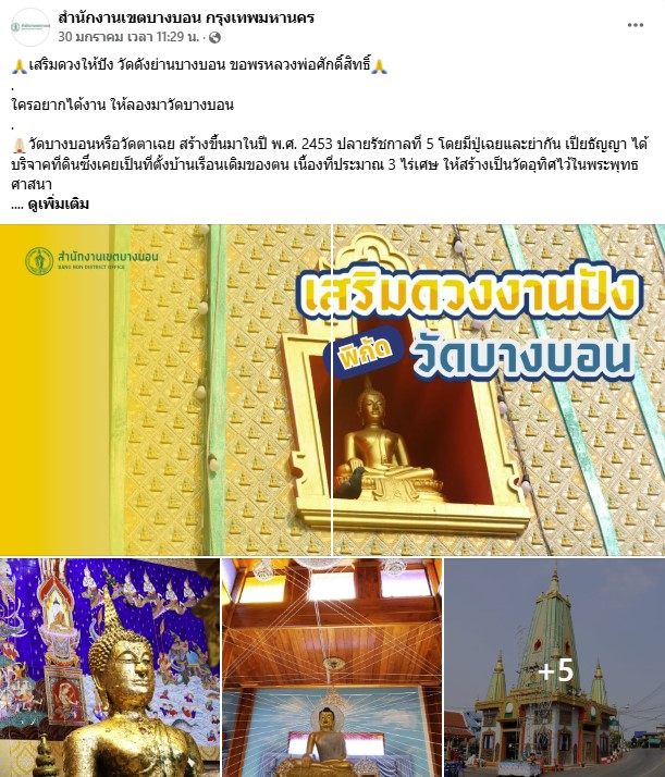 | 5471 |  | 2025-02-25 00:00:00.0000000 | 1.00 | 0.00 |  | สำนักงานเขตบางบอน จัดทำสื่อประชาสัมพันธ์ "วัดบางบอน" เผยแพร่บนสื่อสังคมออนไลน์ Facebook Fanpage สำนักงานเขตบางบอนกรุงเทพมหานคร เมื่อวันที่ 30 มกราคม 2568 | |