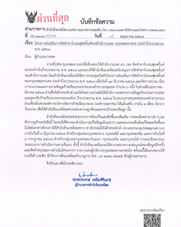 ![]() | - | กิจกรรมการจัดทำคาร์บอนฟุตพริ้นท์ของสำนักงานเขต | 0.00 | 100.00 | สำนักงานเขตบางพลัด | ฝ่ายสิ่งแวดล้อมและสุขาภิบาล |