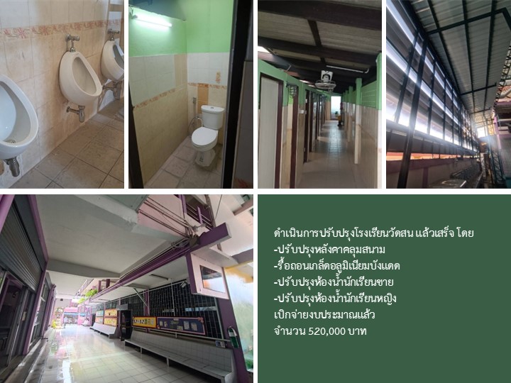162024-06-24 00:00:00.00000001.000.00ดำเนินการปรับปรุงโรงเรียนวัดสน แล้วเสร็จ ตามสัญญาจ้าง เลขที่ ขรณ.17/2567 เบิกจ่ายงบประมาณแล้ว จำนวน 520,000 บาท (ร้อยละ 100 ตามสัญญาจ้าง) โดย - ปรับปรุงหลังคาคลุมสนาม - รื้อถอนเกล็ดอลูมิเนียมบังแดด - ปรับปรุงห้องน้ำนักเรียนชาย - ปรับปรุงห้องน้ำนักเรียนหญิง