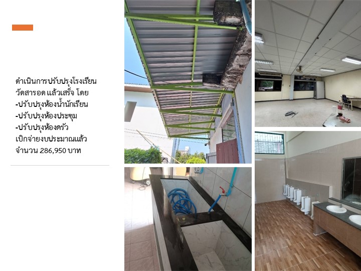 162024-05-23 00:00:00.00000001.000.00ดำเนินการปรับปรุงโรงเรียนวัดสารอด แล้วเสร็จ ตามสัญญาจ้างเลขที่ ขรณ.6/2567 เบิกจ่ายงบประมาณแล้ว จำนวน 286,950 บาท (ร้อยละ 100 ตามสัญญาจ้าง) โดย - ปรับปรุงห้องน้ำนักเรียน - ปรับปรุงห้องประชุม - ปรับปรุงห้องครัว