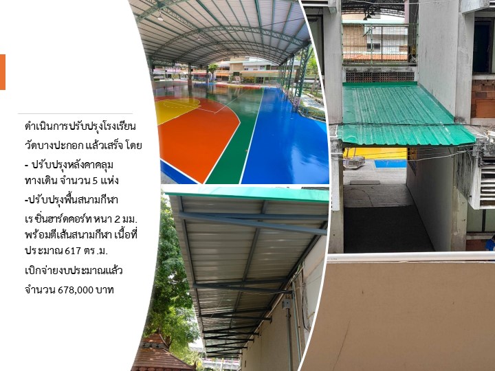 162024-05-23 00:00:00.00000001.000.00ดำเนินการปรับปรุงโรงเรียนวัดบางปะกอก แล้วเสร็จ ตามสัญญาจ้างเลขที่ ขรณ.11/2567 เบิกจ่ายงบประมาณแล้ว จำนวน 678,000 บาท (ร้อยละ 100 ตามสัญญาจ้าง) โดย - ปรับปรุงหลังคาคลุมทางเดิน จำนวน 5 แห่ง - ปรับปรุงพื้นสนามกีฬา เรซิ่นฮาร์ดคอร์ท หนา 2 มม. พร้อมตีเส้นสนามกีฬา เนื้อที่ประมาณ 617 ตร.ม.
