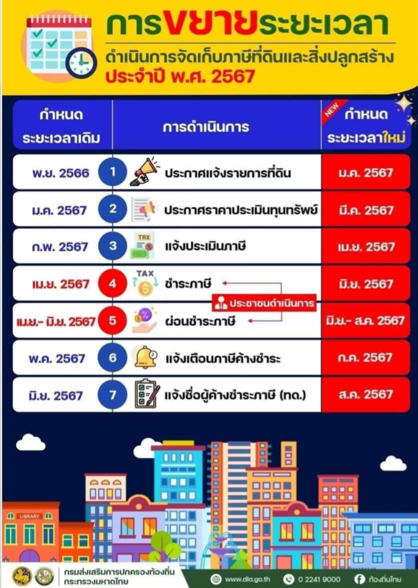 | 147 | ![]() | 2024-04-24 00:00:00.0000000 | 0.00 | 0.00 | ขยายระยะเวลาเเจ้งการประเมินภาษี จากเดือนเมษายน เป็น เดือนพฤษภาคม 2567 | ||
