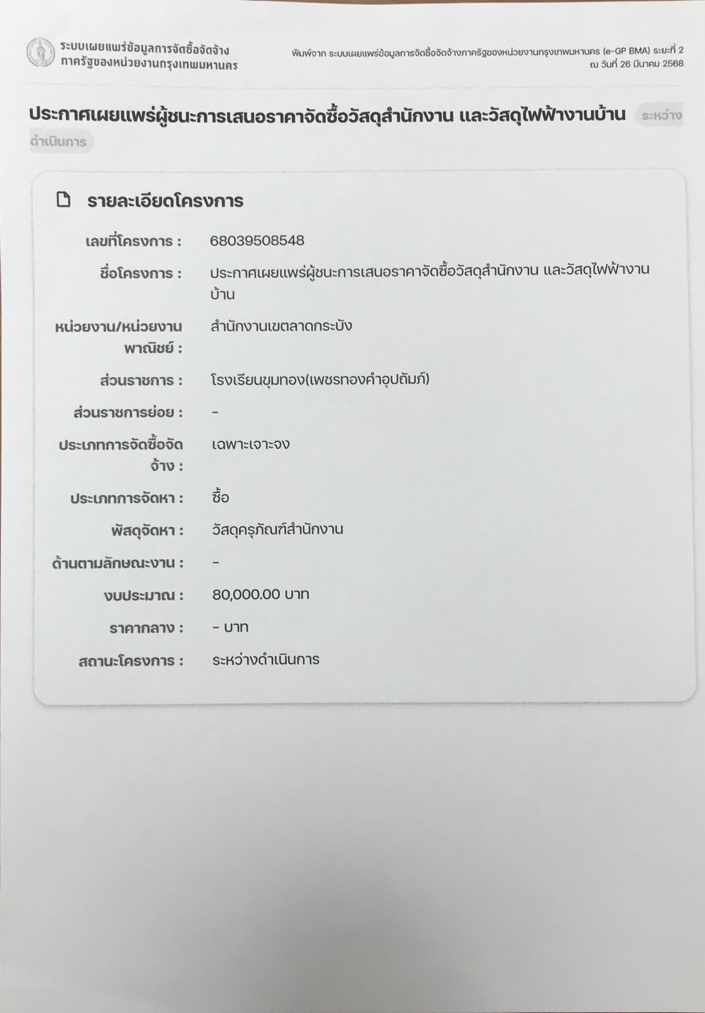 ข้อมูลโครงการ :: การเผยแพร่ข้อมูลการจัดซื้อจัดจ้างภาครัฐของหน่วยงาน (e-GP BMA) เขตลาดกระบัง ถูกเปิดเผยอย่างครบถ้วน
