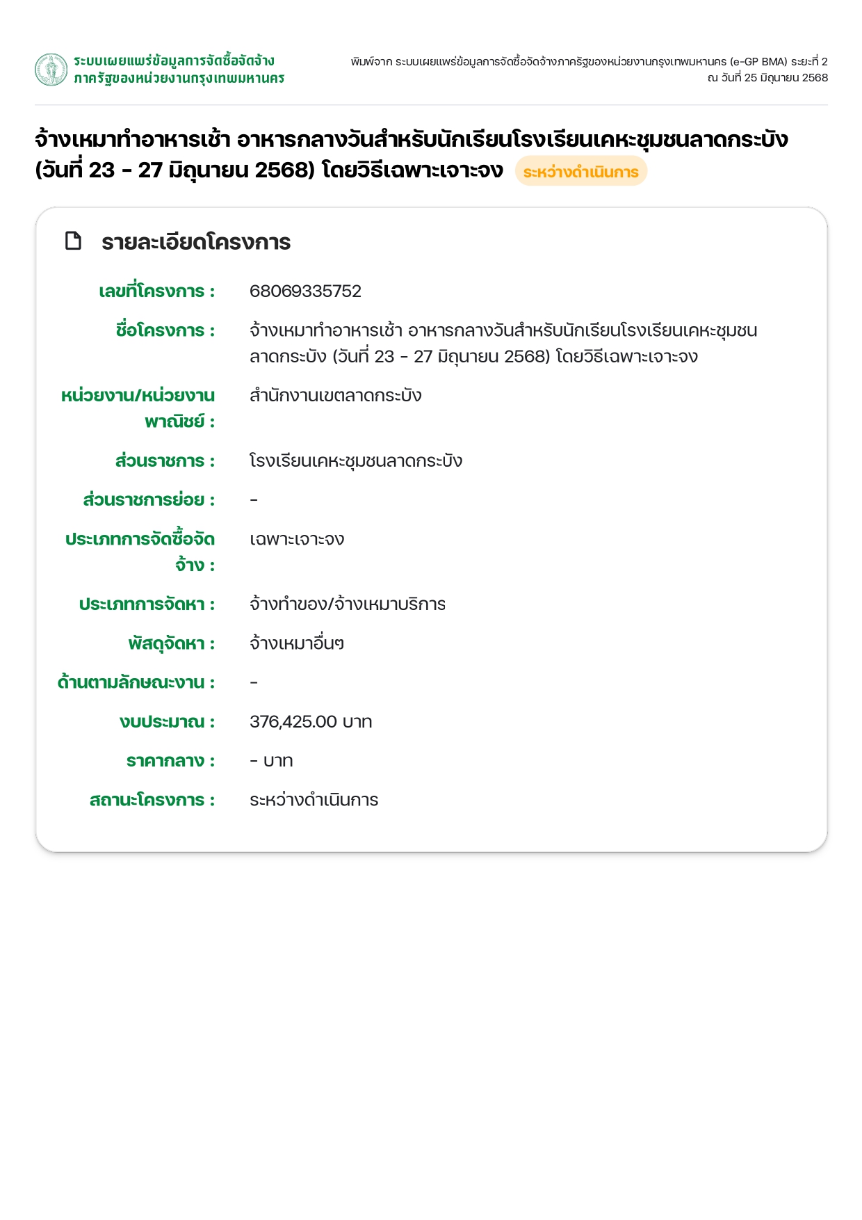 51342025-06-25 00:00:00.00000000.000.00ข้อมูลการจัดซื้อจัดจ้างภาครัฐของหน่วยงานกรุงเทพมหานคร (e-GP BMA) เดือนตุลาคม 2567 - เดือนมิถุนายน 2568 มีโครงการที่ใช้จ่ายจากเงินงบประมาณกรุงเทพมหานคร ที่ได้ดำเนินการจัดซื้อจัดจ้างในปีงบประมาณ พ.ศ. 2568 ที่เปิดเผยในระบบ E-GP BMA2 จำนวน 618 โครงการ ถูกเปิดเผยอย่างครบถ้วน