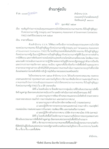 122 2024-07-24 00:00:00.0000000 0.00 0.00 สำนักงาน ก.ก. ได้มีหนังสือ ที่ กท 0307/4728 ลงวันที่ 28 มิถุนายน 2567 ถึงสำนักการโยธา สำนักการระบายน้ำ สำนักสิ่งแวดล้อม และสำนักการจราจรและขนส่ง ขอแจ้งการดำเนินการตามกระบวนการประเมินคุณธรรมและความโปร่งใสในการดำเนินงานของหน่วยงานภาคเอกชนที่เป็นคู่ค้าคู่สัญญากับหน่วยงานภาครัฐ (Integrity and Transparency Assessment of Government Contractors: ITAGC) ประจำปีงบประมาณ พ.ศ. 2567 เพื่อให้มอบหมายเจ้าหน้าที่ผู้รับผิดชอบดำเนินการตอบแบบวัดการรับรู้ของผู้มีส่วนได้ส่วนเสียภายนอก สำหรับภาครัฐที่เป็นคู่ค้าคู่สัญญา (ITAGC – E1) ของหน่วยงานภาคเอกชนที่เป็นคู่ค้าคู่สัญญากับหน่วยงานดังกล่าว ตามโครงการจัดซื้อจัดจ้าง ในระบบ ITAGC System ระหว่างวันที่ 1 เมษายน – 31 กรกฎาคม 2567 ตามที่ได้รับการประสานจากสำนักงาน ป.ป.ช. ตามหนังสือสำนักงาน ป.ป.ช. ที่ ปช 0009/ว 0048 ลงวันที่ 10 มิถุนายน 2567 และอยู่ระหว่างการประเมินคุณธรรมและความโปร่งใสในการดำเนินงานของหน่วยงานภาคเอกชนที่เป็นคู่ค้าคู่สัญญากับหน่วยงานภาครัฐ (Integrity and Transparency Assessment of Government Contractors: ITAGC) ประจำปีงบประมาณ พ.ศ. 2567 สิ้นสุดการประเมินวันที่ 31 กรกฎาคม 2567 ตามหนังสือสำนักงาน ป.ป.ช. ที่ ปช 0009/ว 0048 ลงวันที่ 10 มิถุนายน 2567